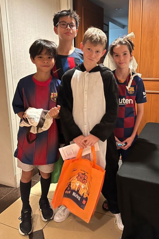 Tia and her boys on a grand chair surrounded by festive Christmas decorations at the mall. Four friends dressed for Halloween, three soccer teams and the penguin mascot Mason and friends in costume on Halloween Cousins reunited in Texas after a few years of not seeing each other! Tia grilling the food while Matt enjoys it at a Korean barbecue restaurant in Singapore.