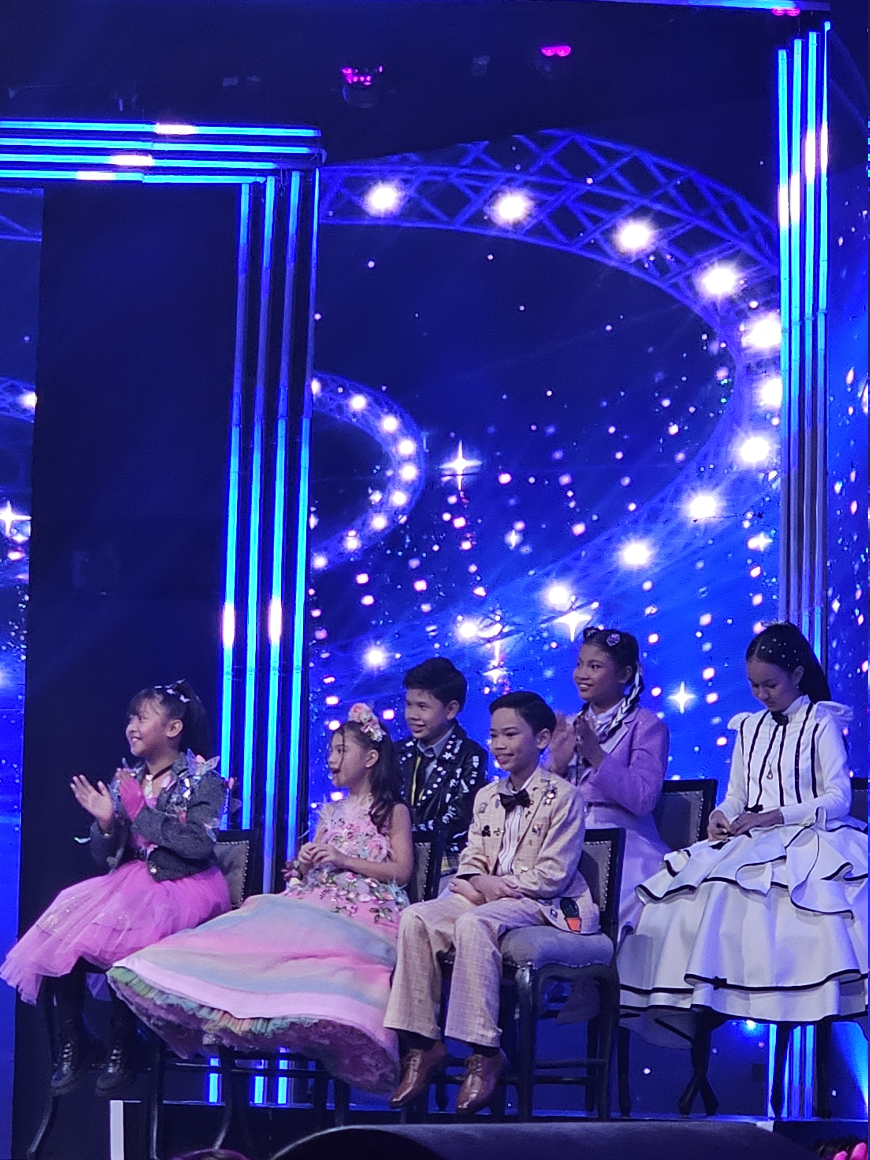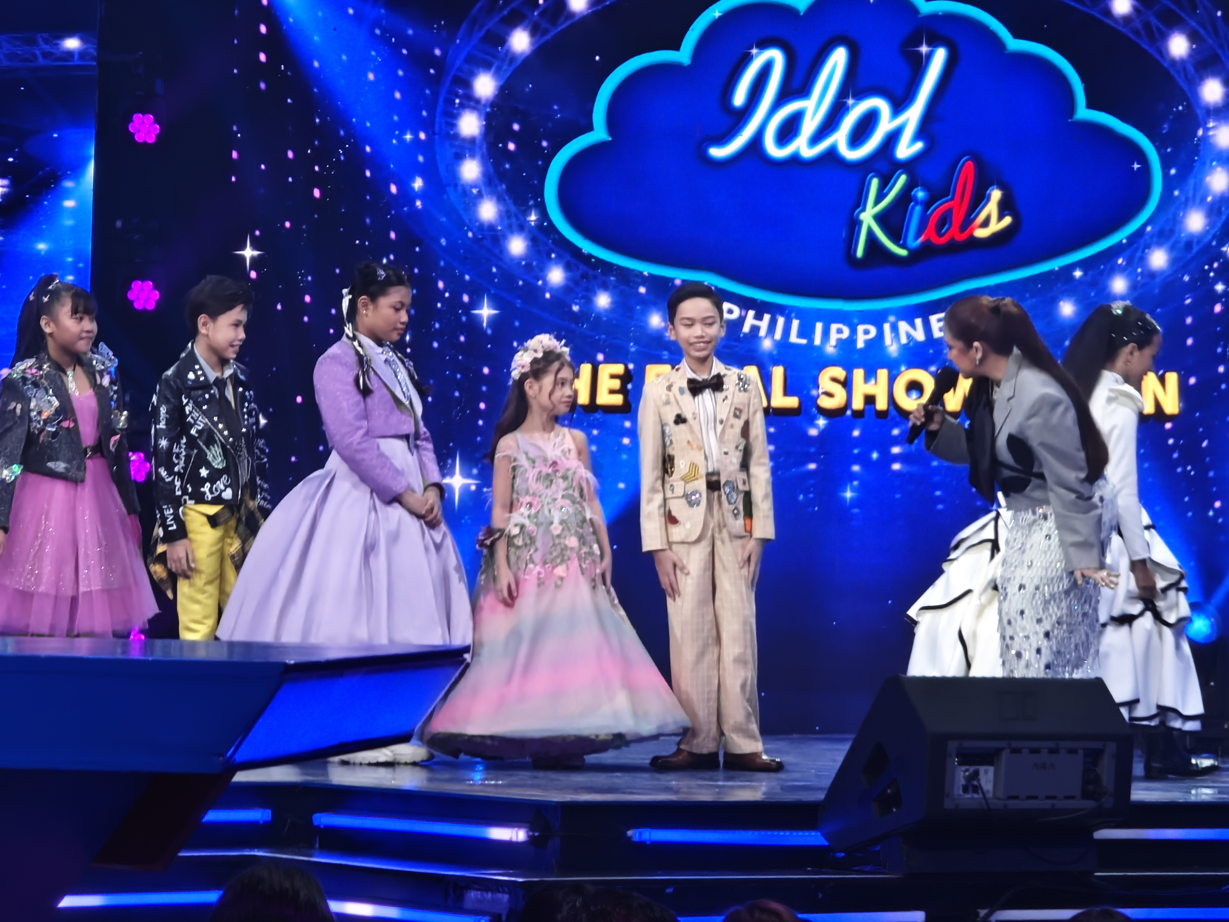 Top 6 Kids dressed in colorful costumes enjoy a moment on stage during Idol Kids Philippines final showdown.