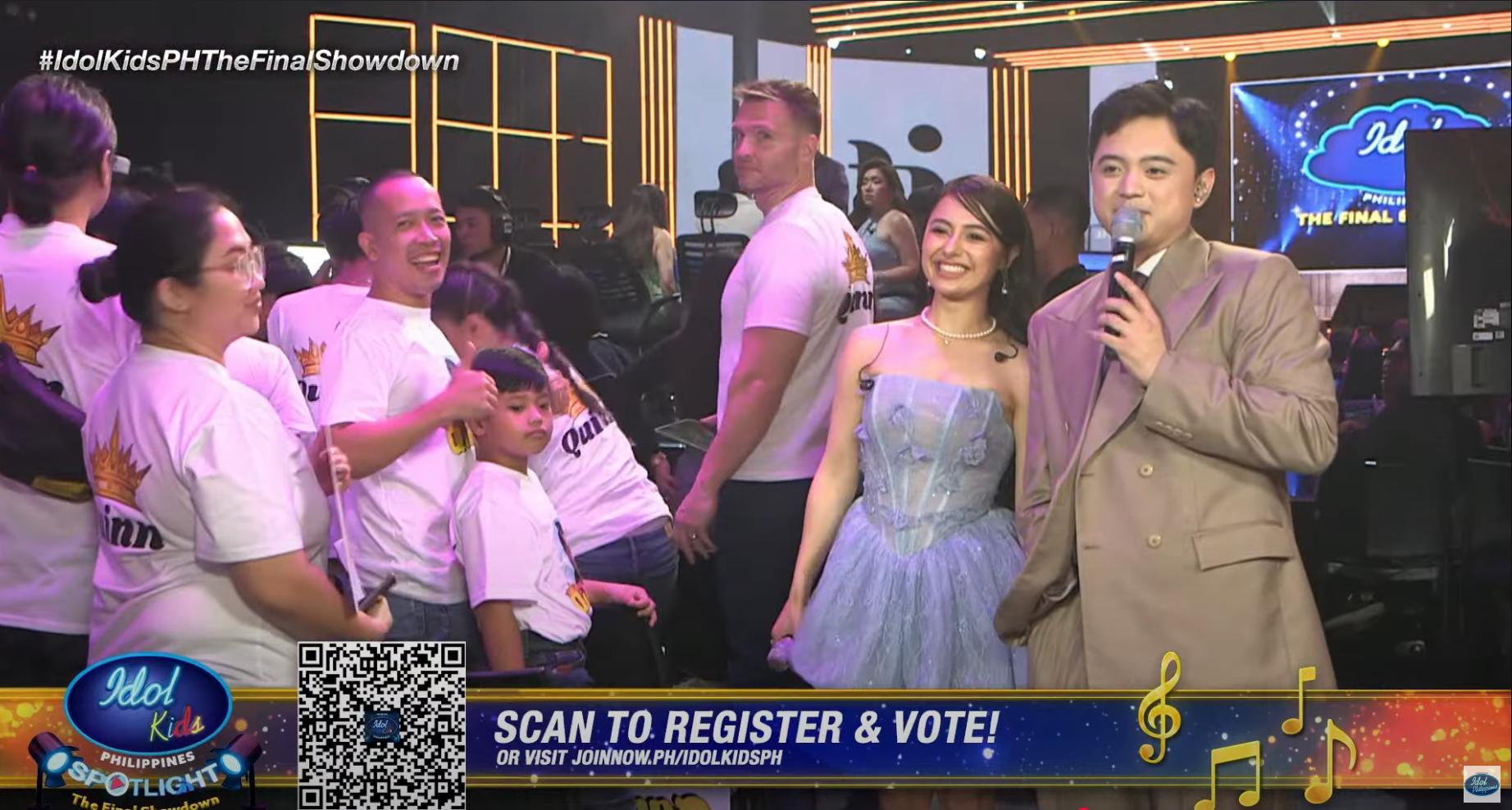 Hosts on stage at Idol Kids Philippines while audience members (Matt & Tia) wearing 'Quinn' shirts look on during The Final Showdown.