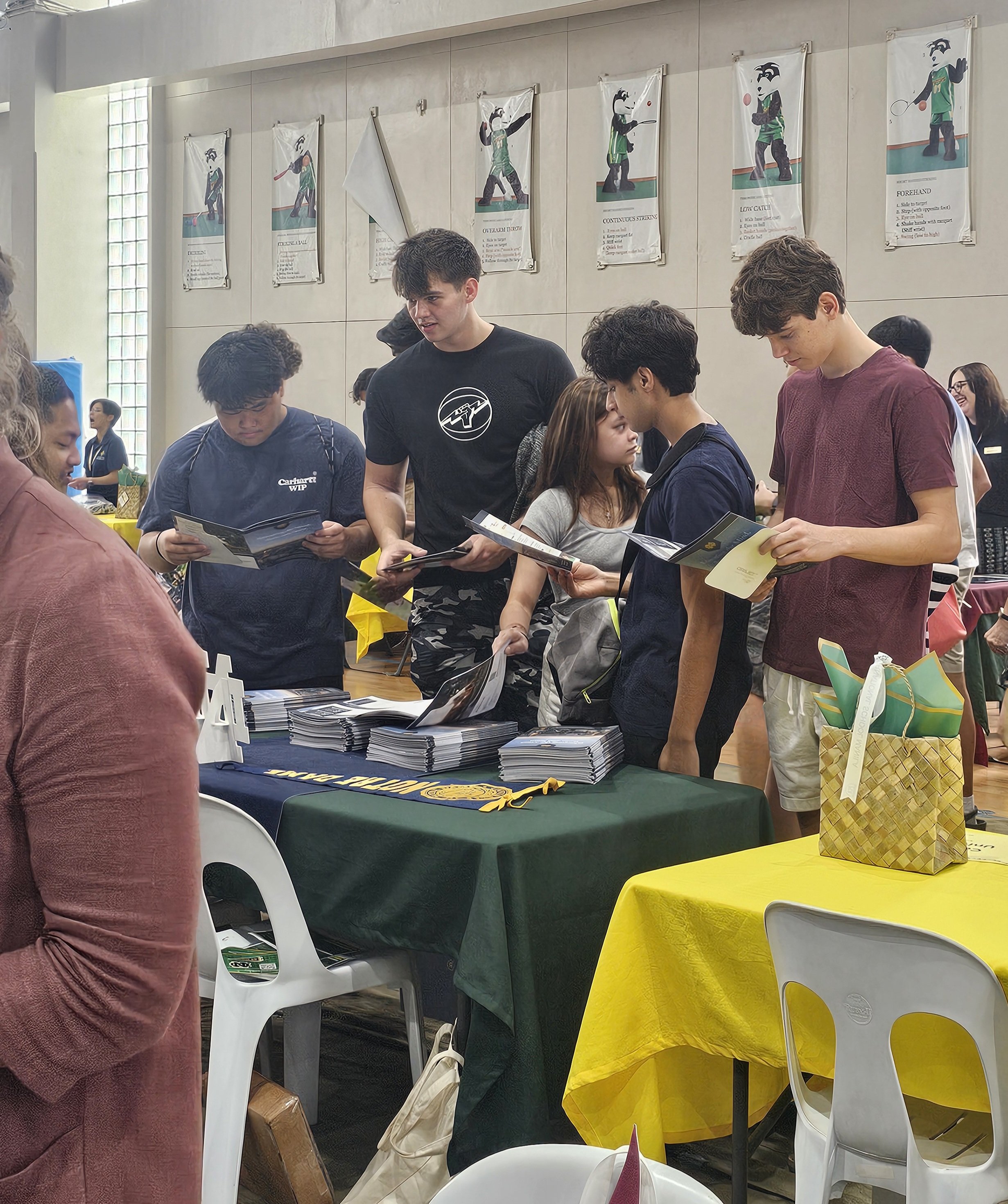 Mason with other friends learning about universities at the Manila World University Fair that ISM hosted