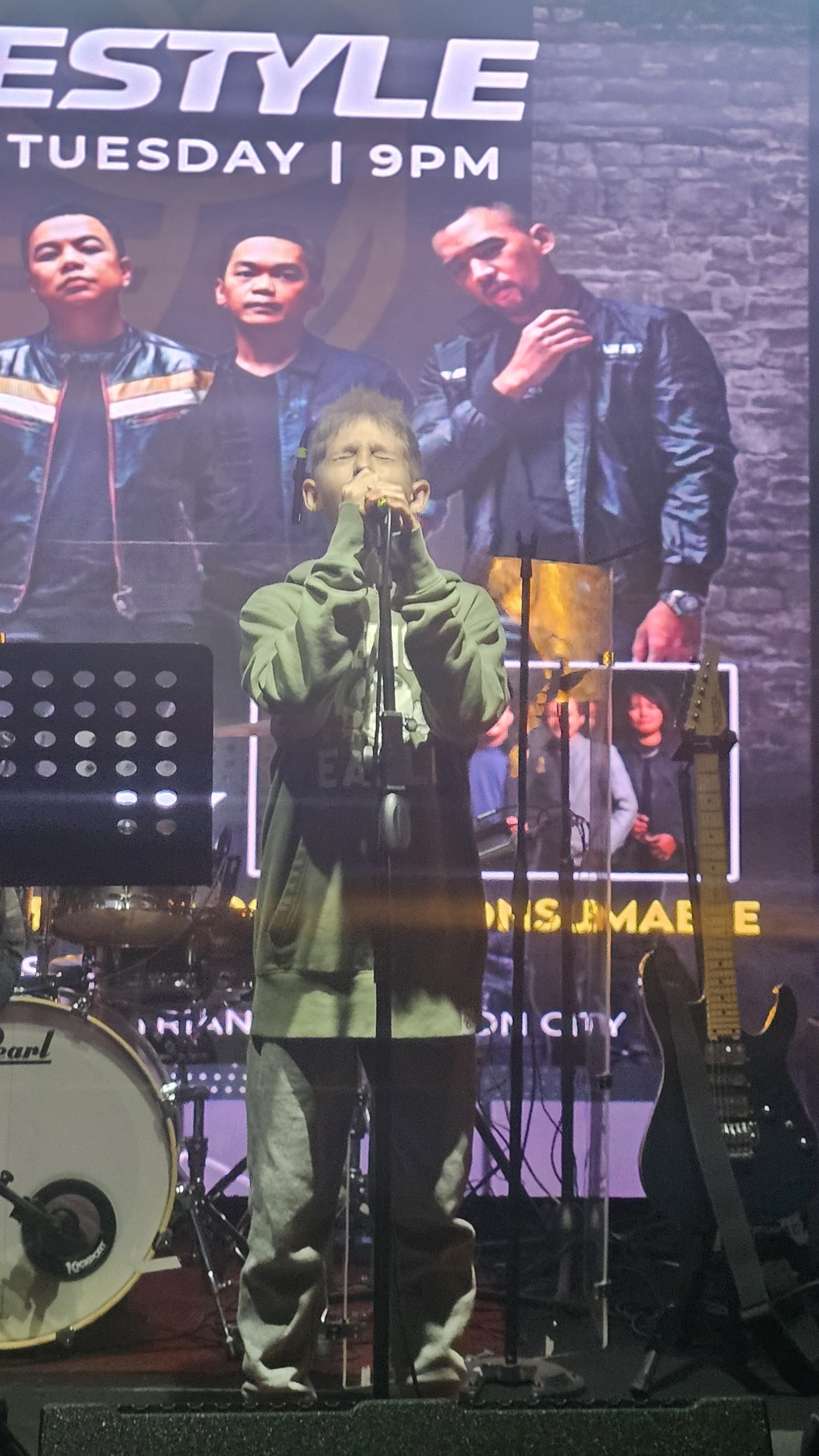 Blake pretending he is a lead singer on stage at Noctos Music Bar