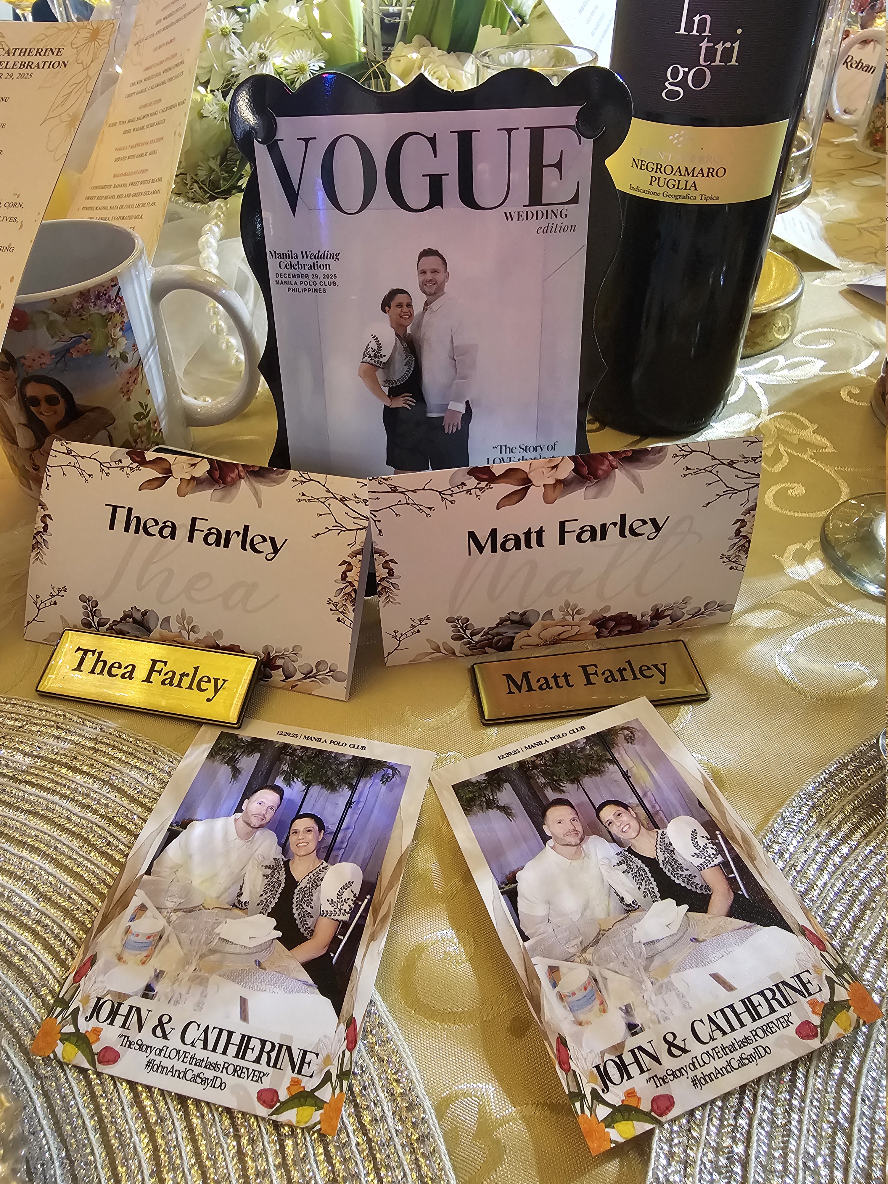 Thea Farley and Matt Farley celebrate at John and Catherine's wedding reception with personalized table settings and photos.