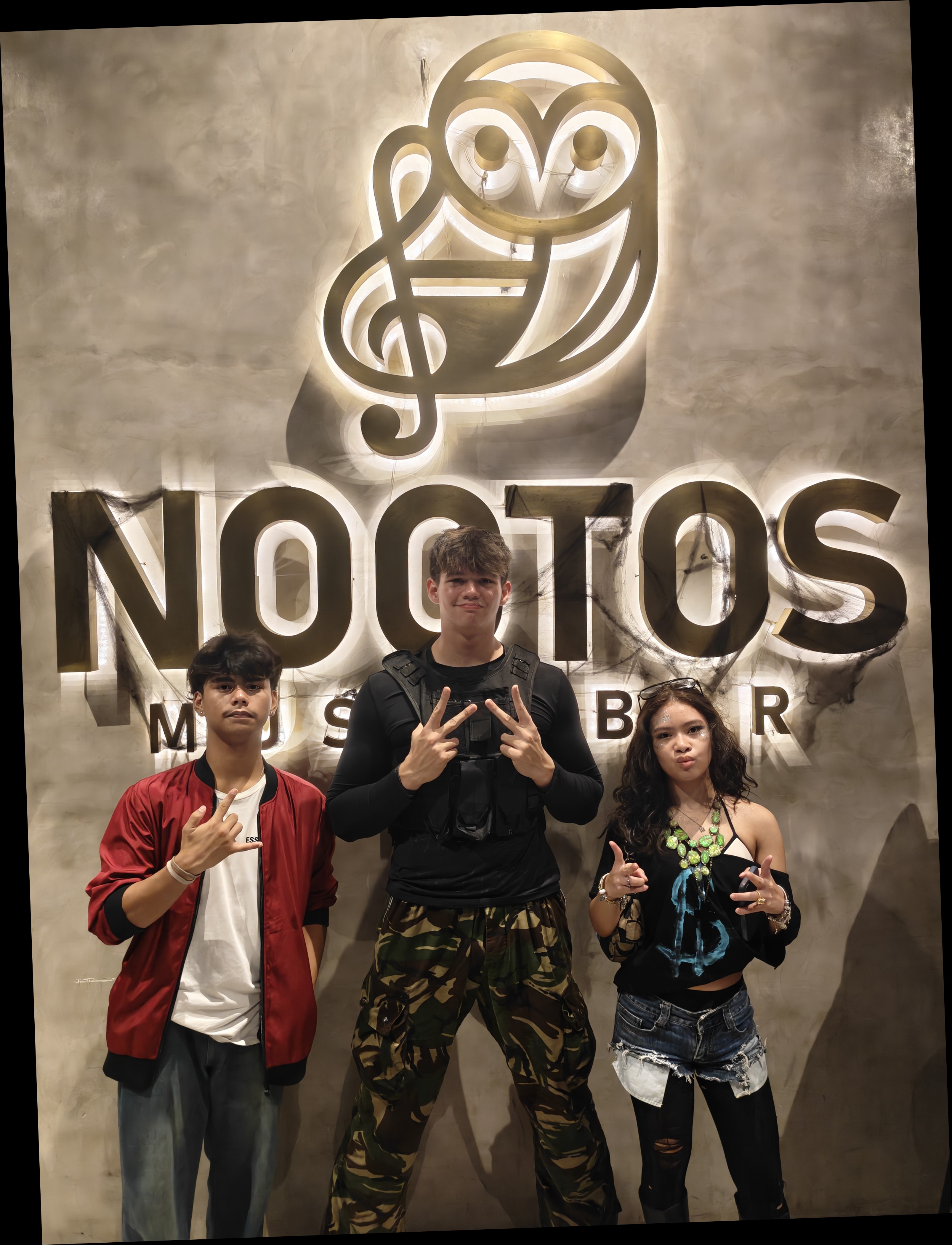 Xander, Mason, Sayza strike a Halloween pose at the entrance of Noctos Music Bar.