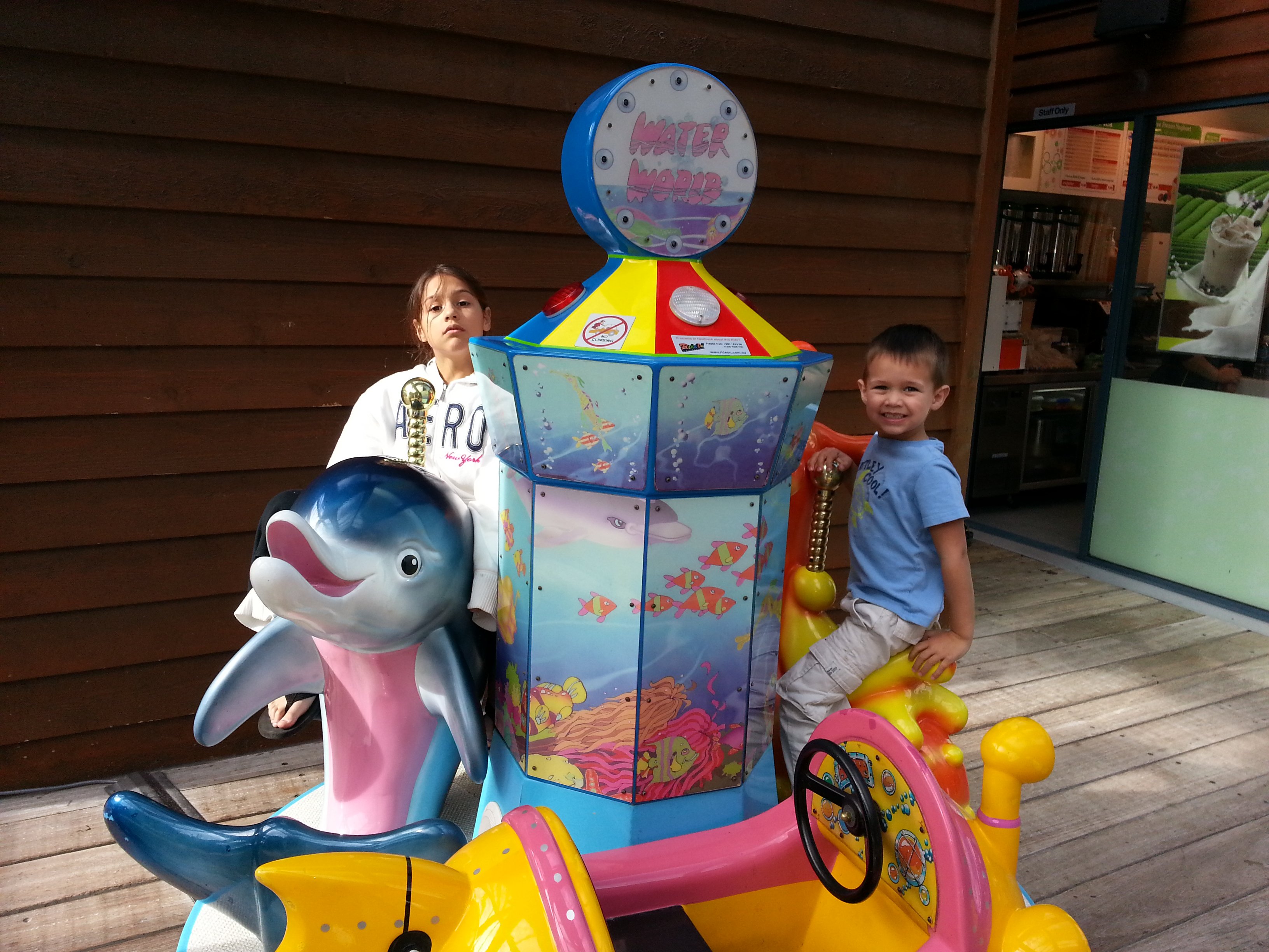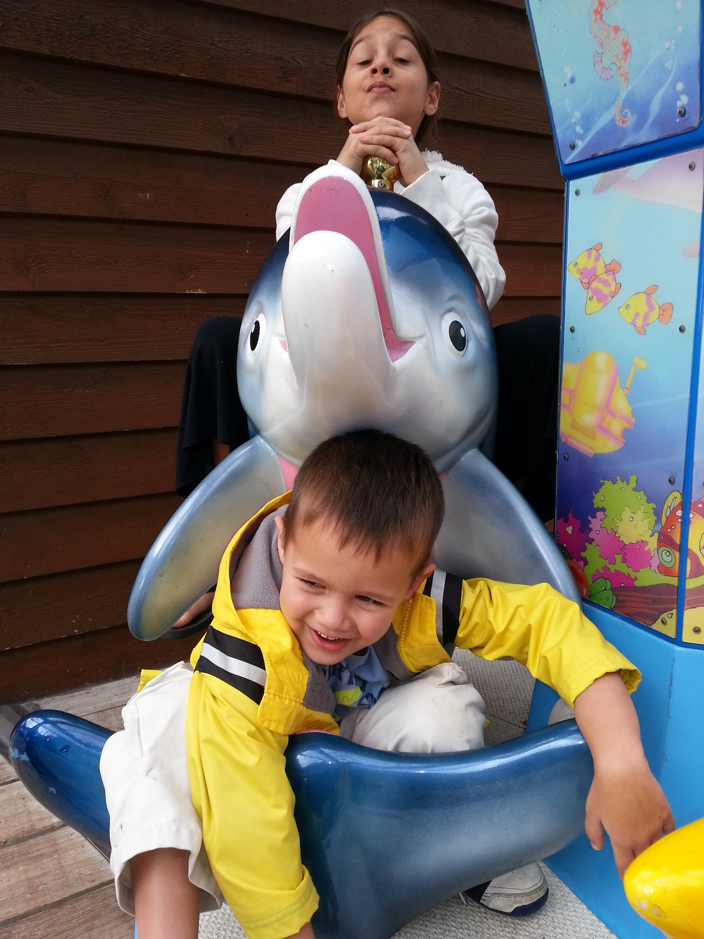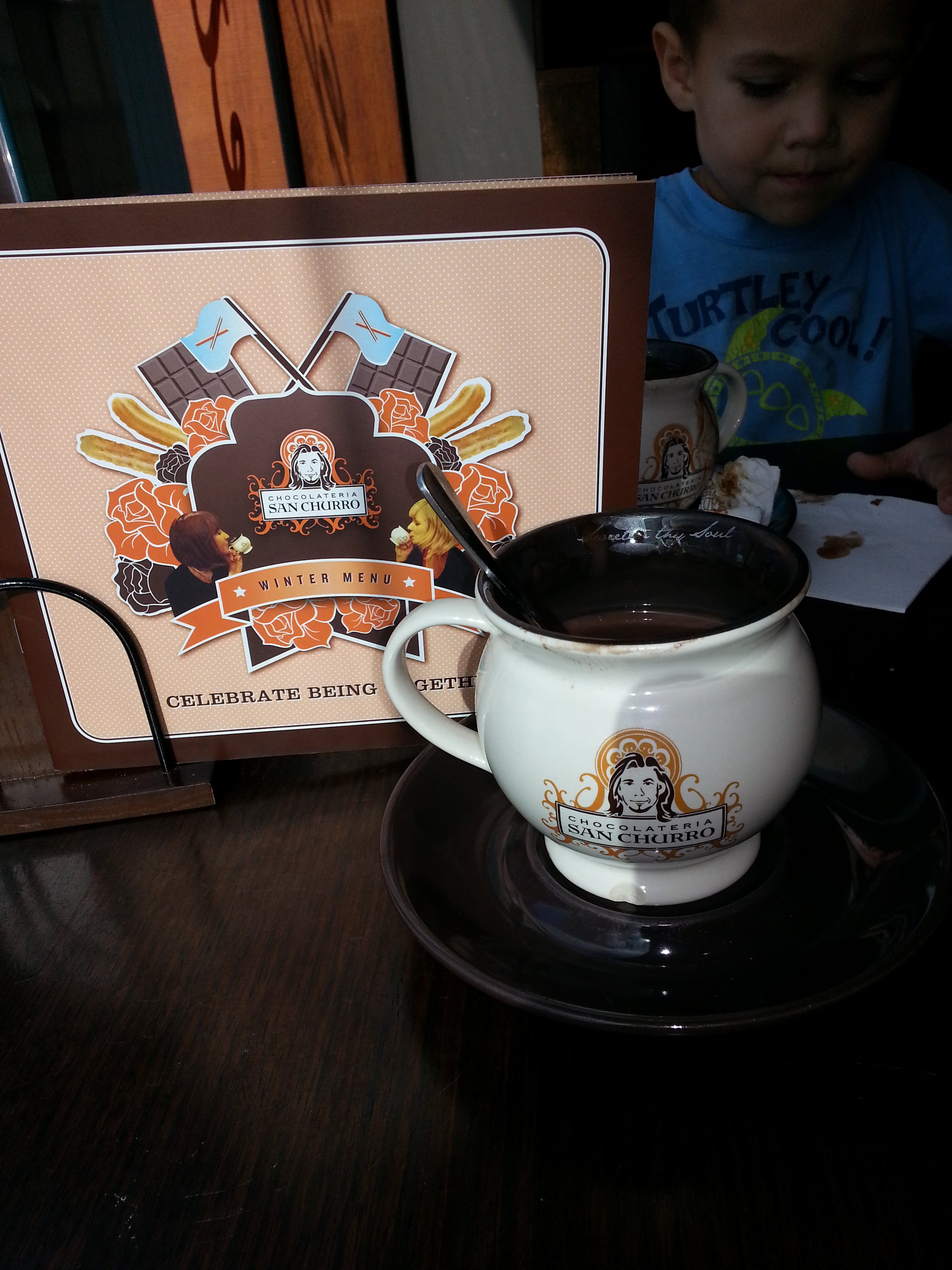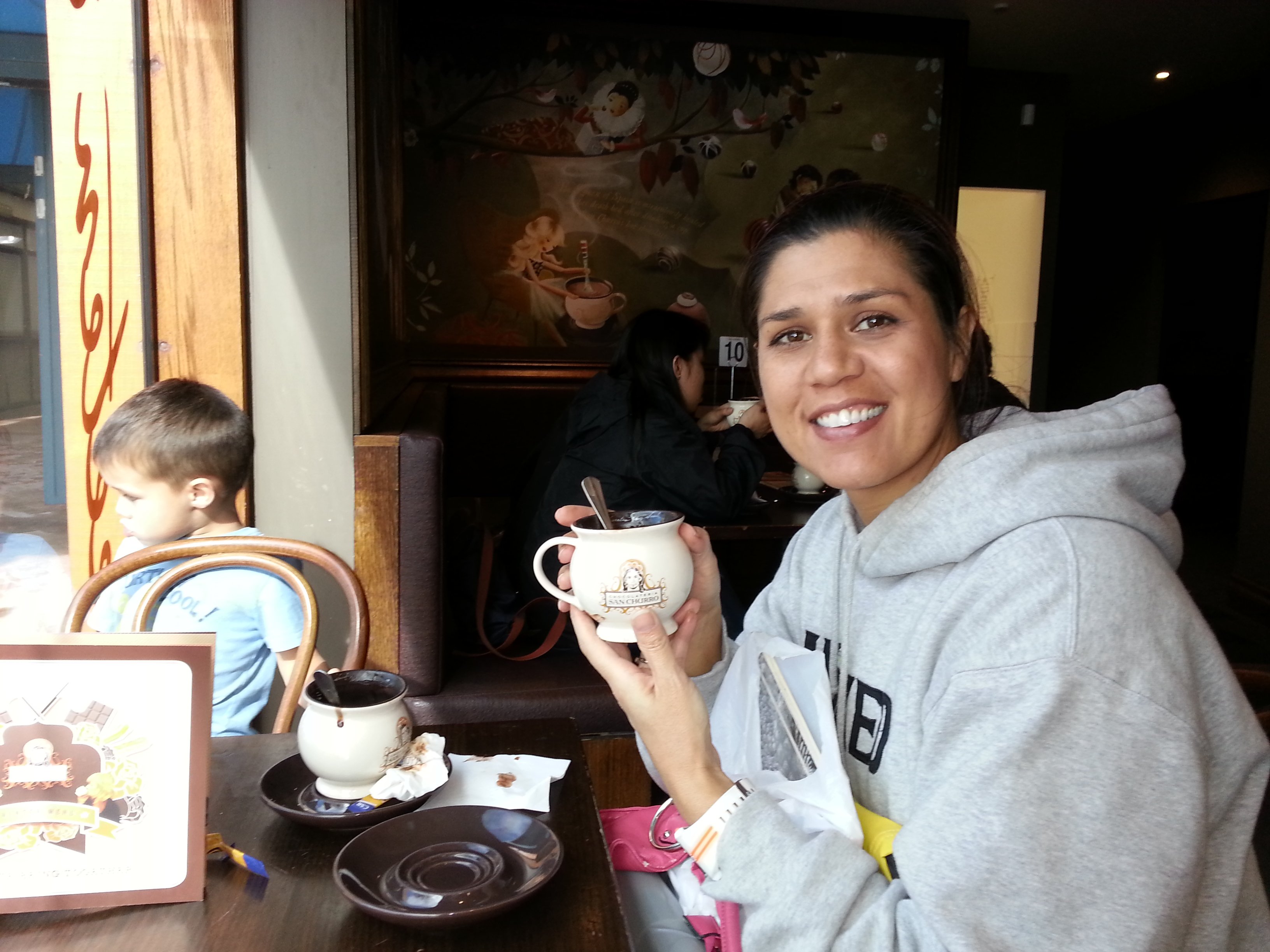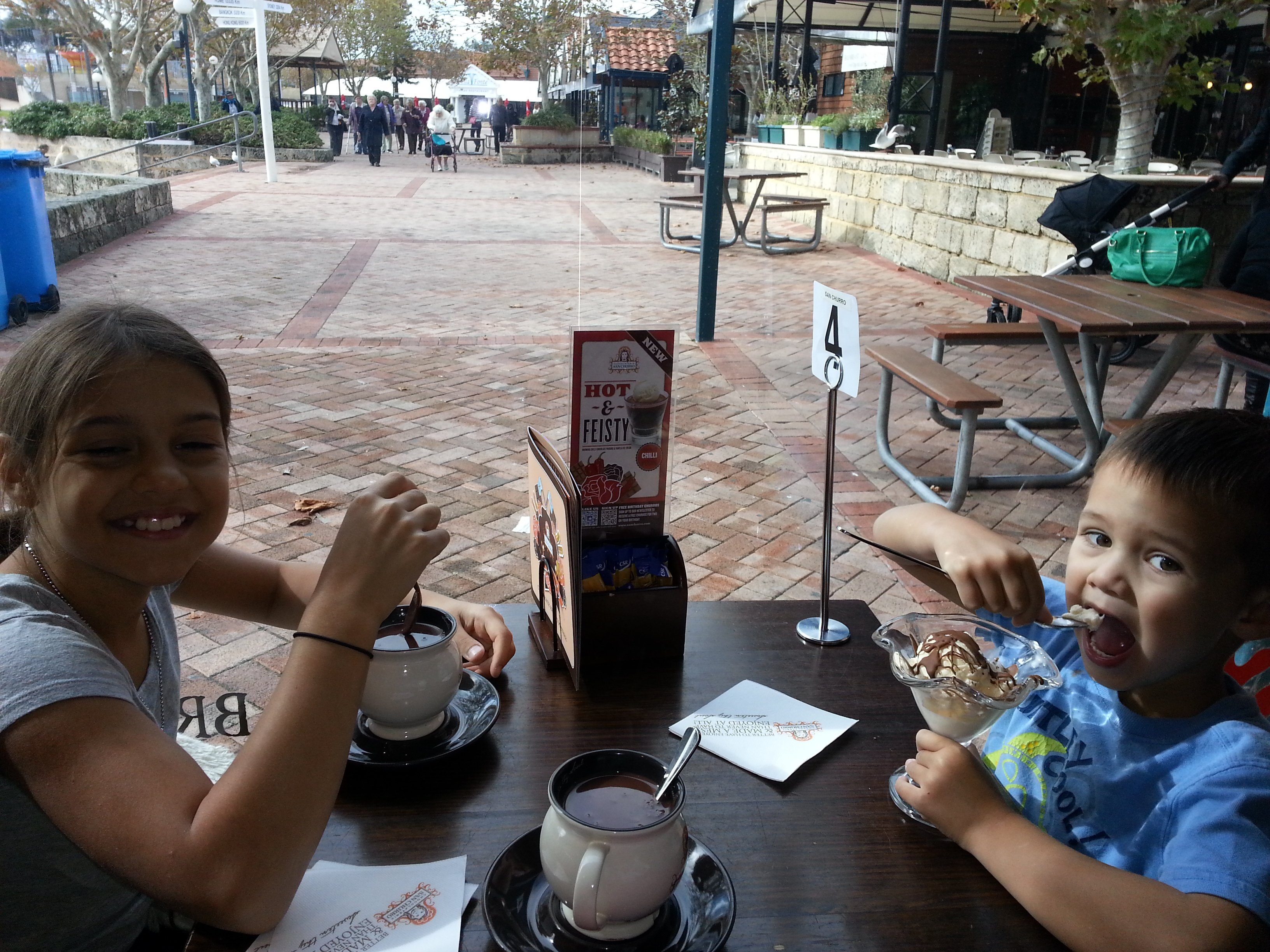 Kalani enjoying her hot chocolate and Mason enjoying his ice cream
