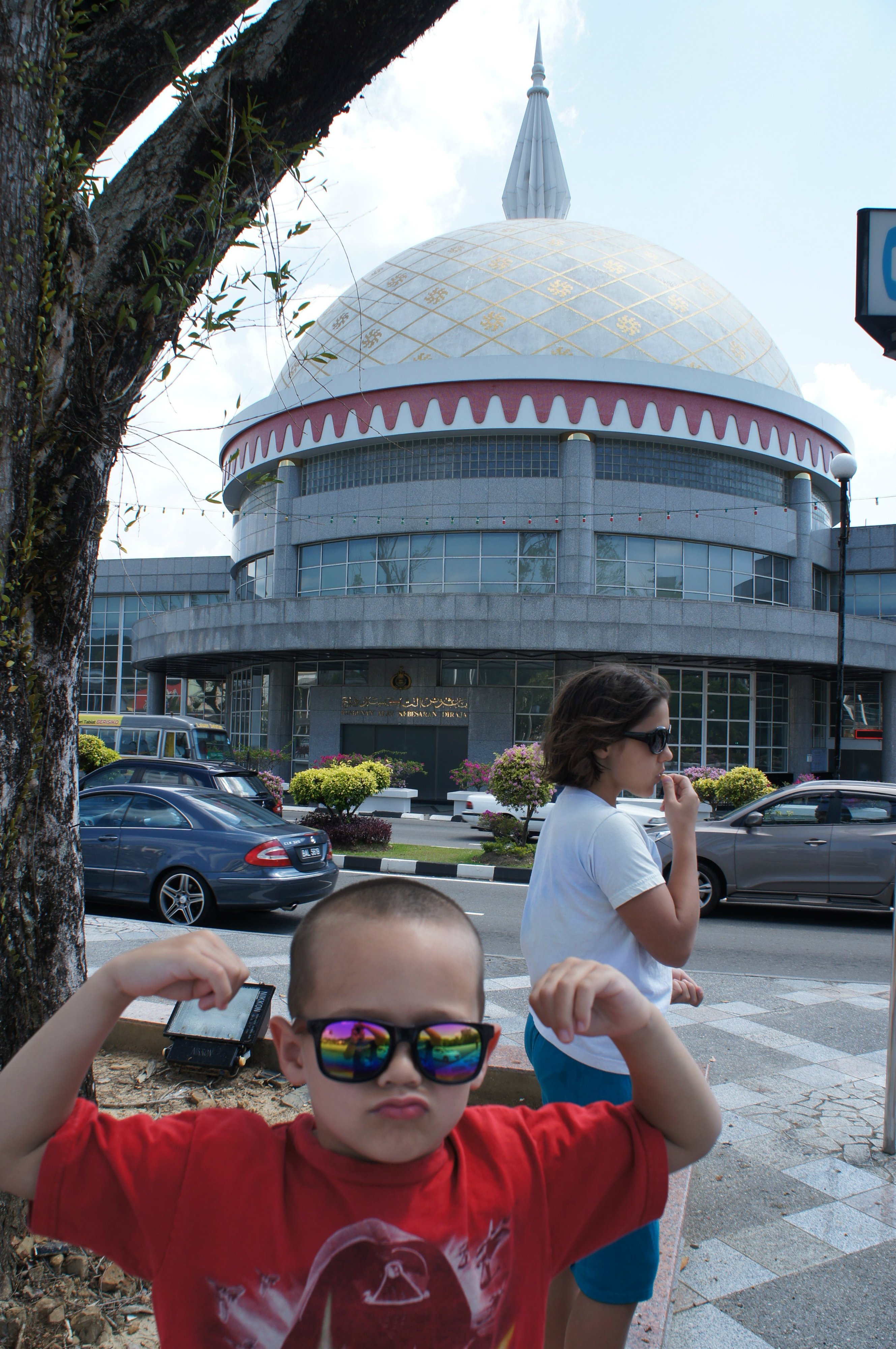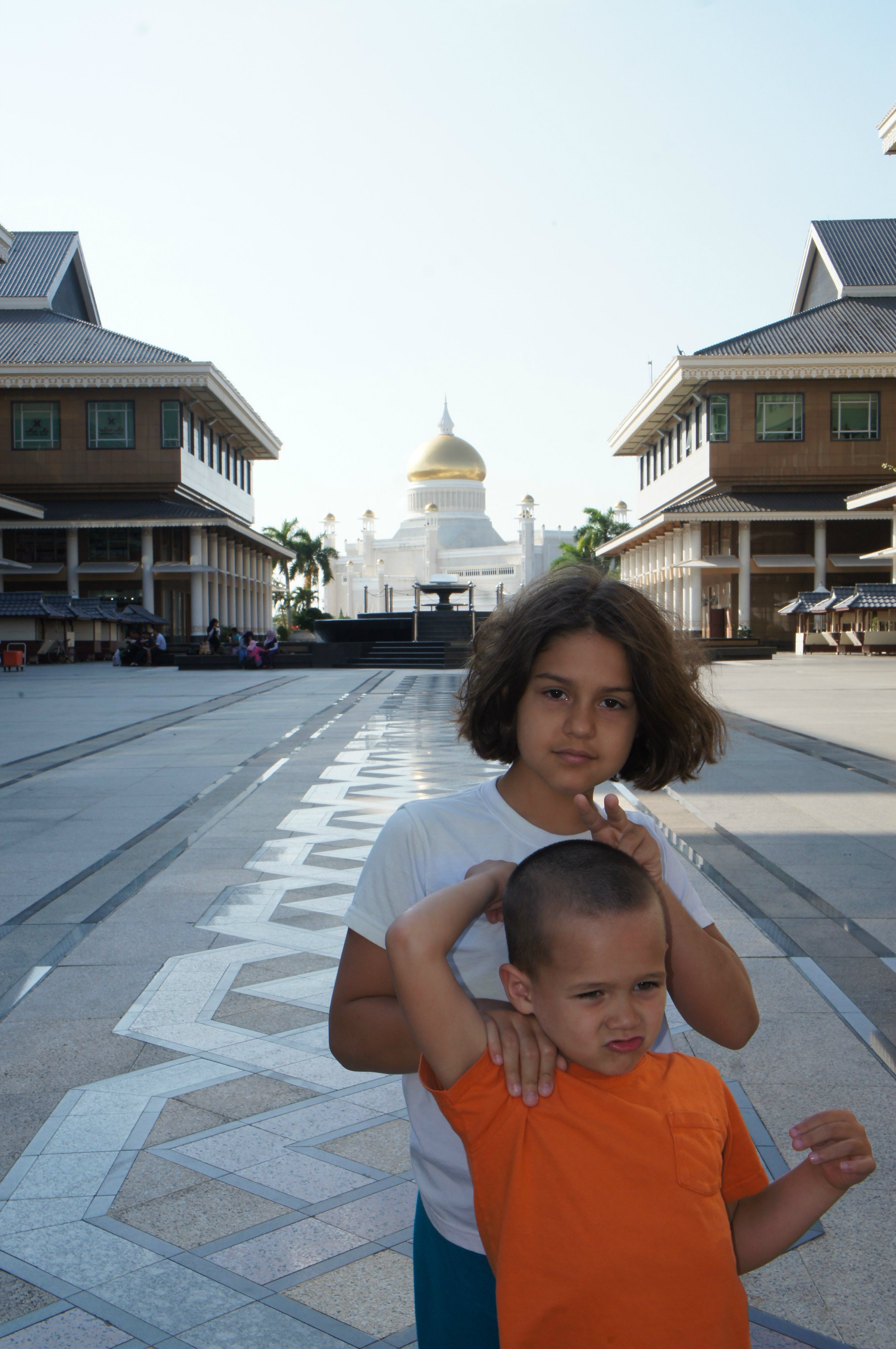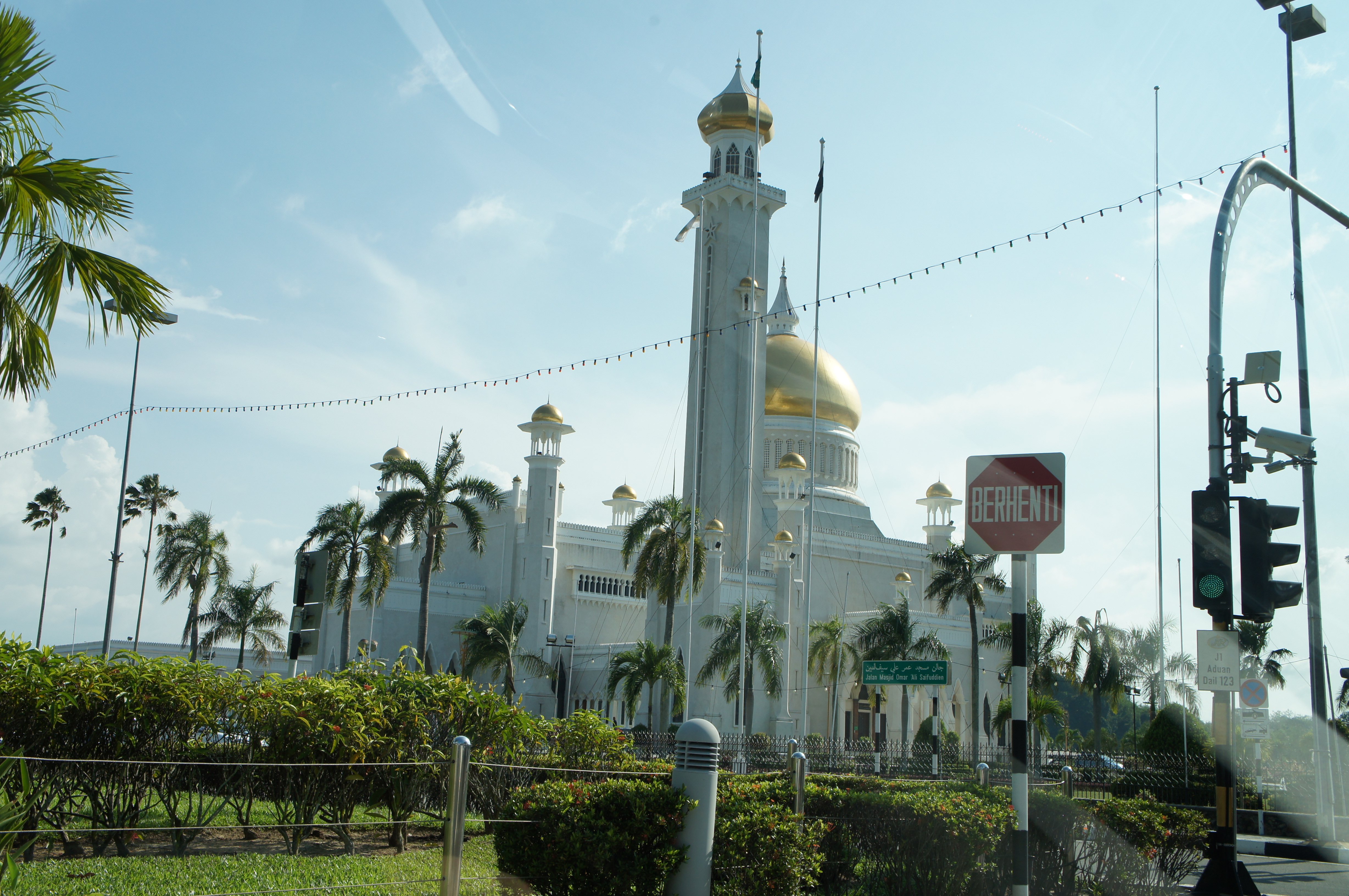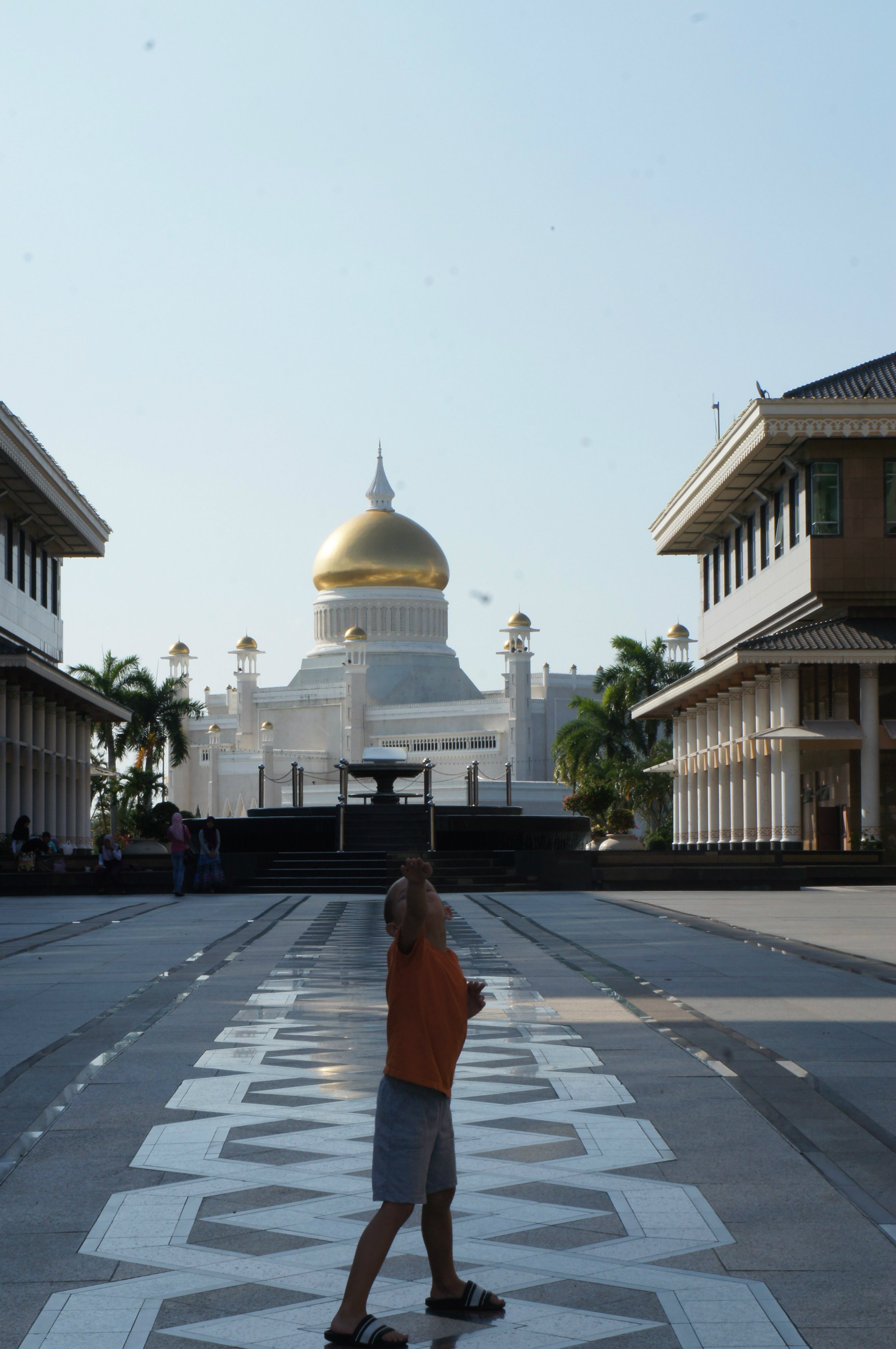Walking around shopping centers with mosques in the back...must be in Brunei