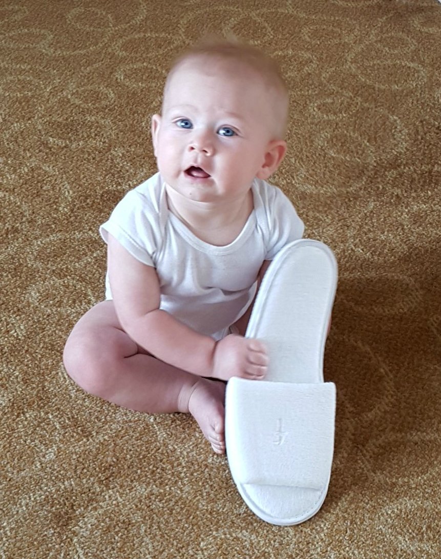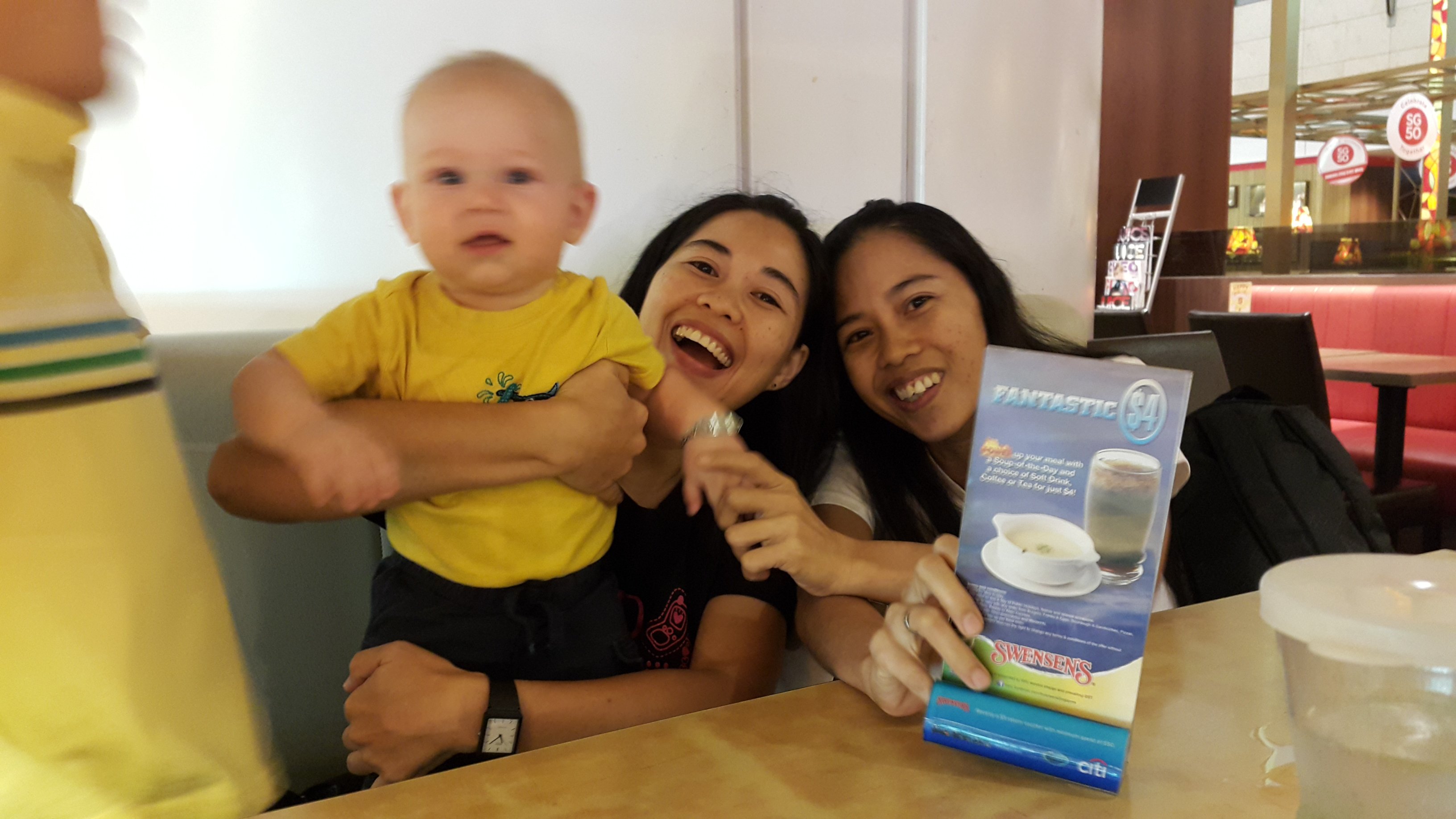 Sisters Honey & Janey play with Blake while we wait for our food and our flight at the airport