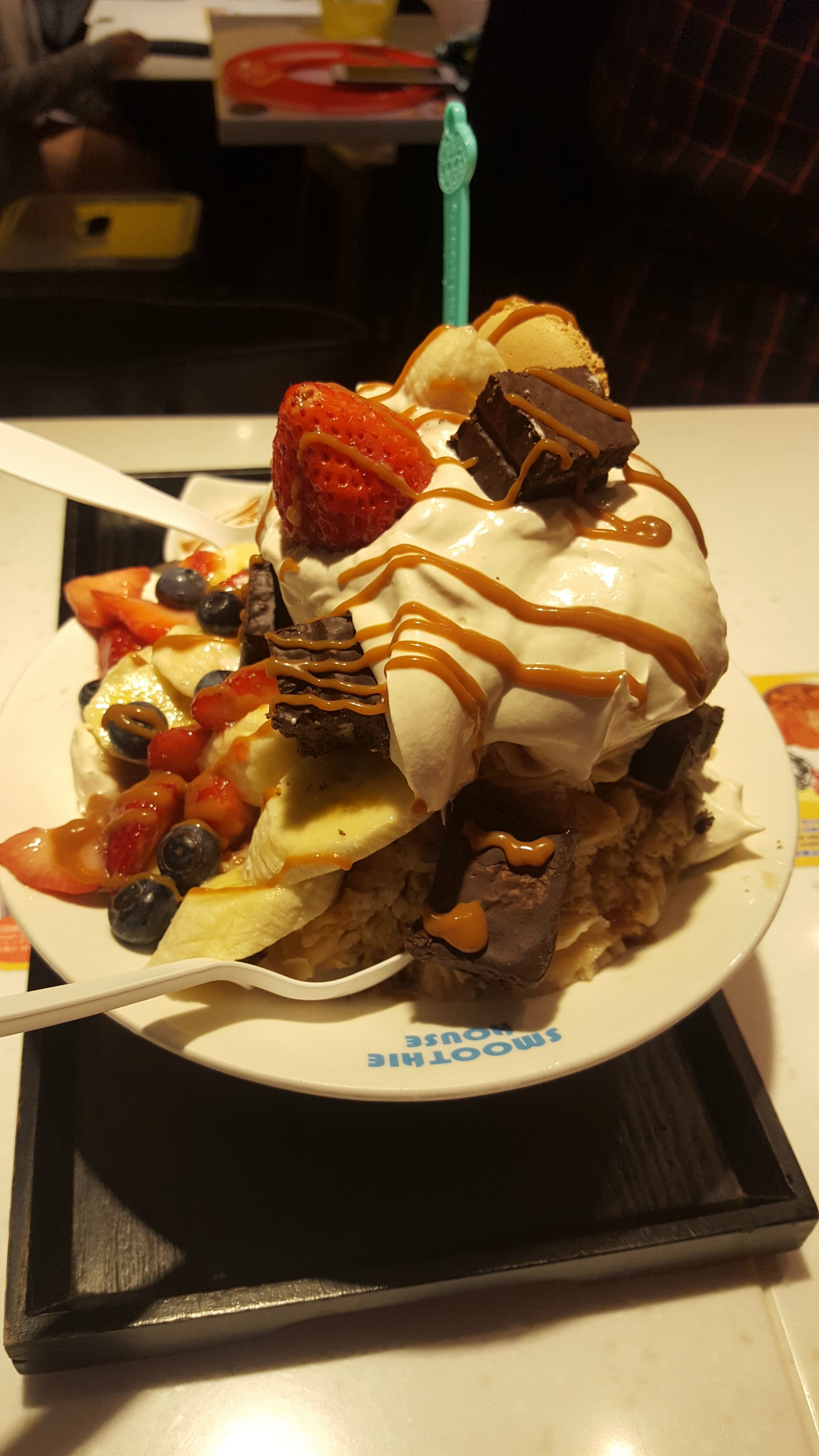 Enjoying coffee flavor snowflake ice with bananas, brownies, strawberries & blueberries on our date night in Taipei, Taiwan