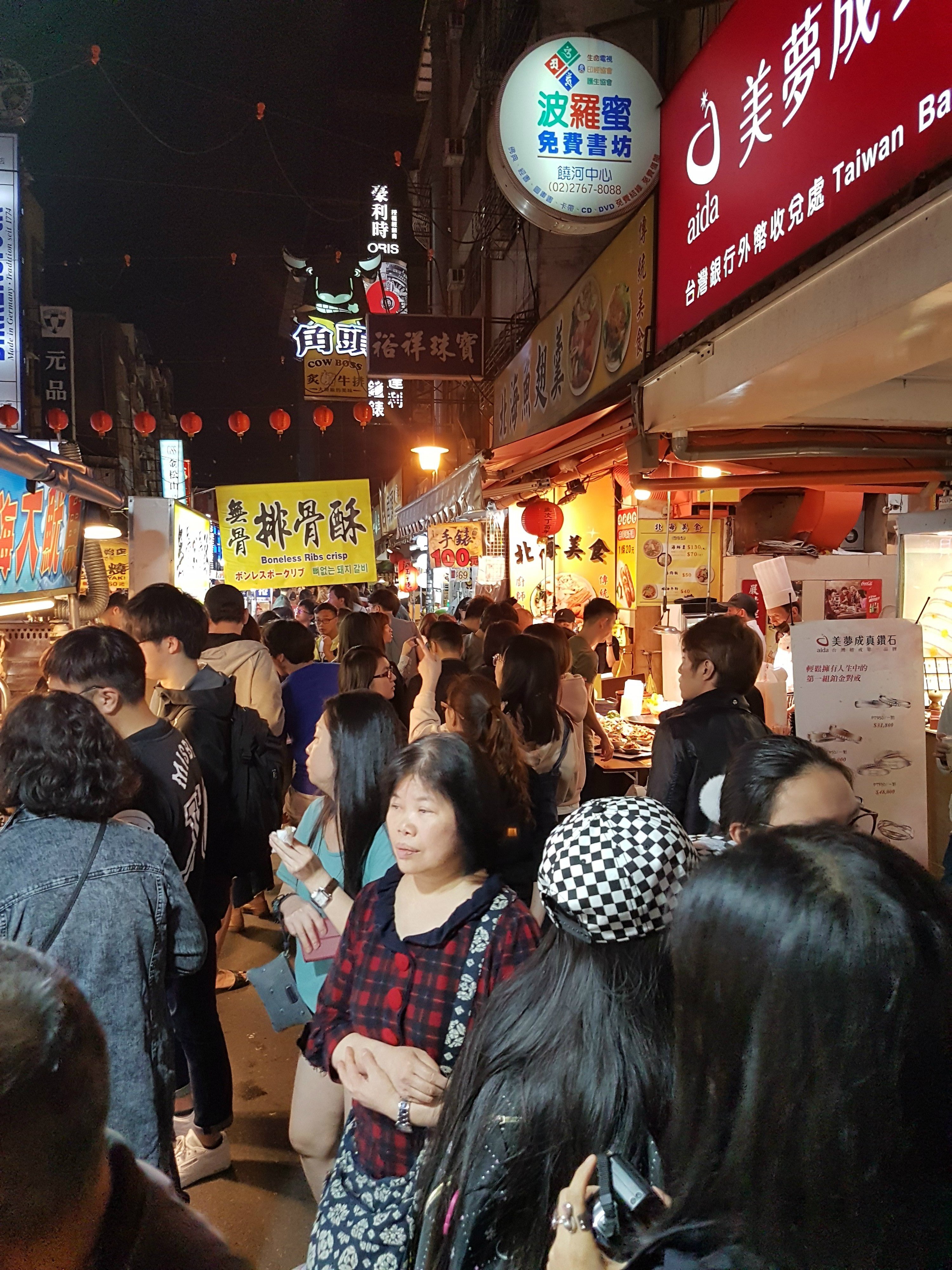 Tia checking out hand painted shoes at the night market in Taipei, Taiwan