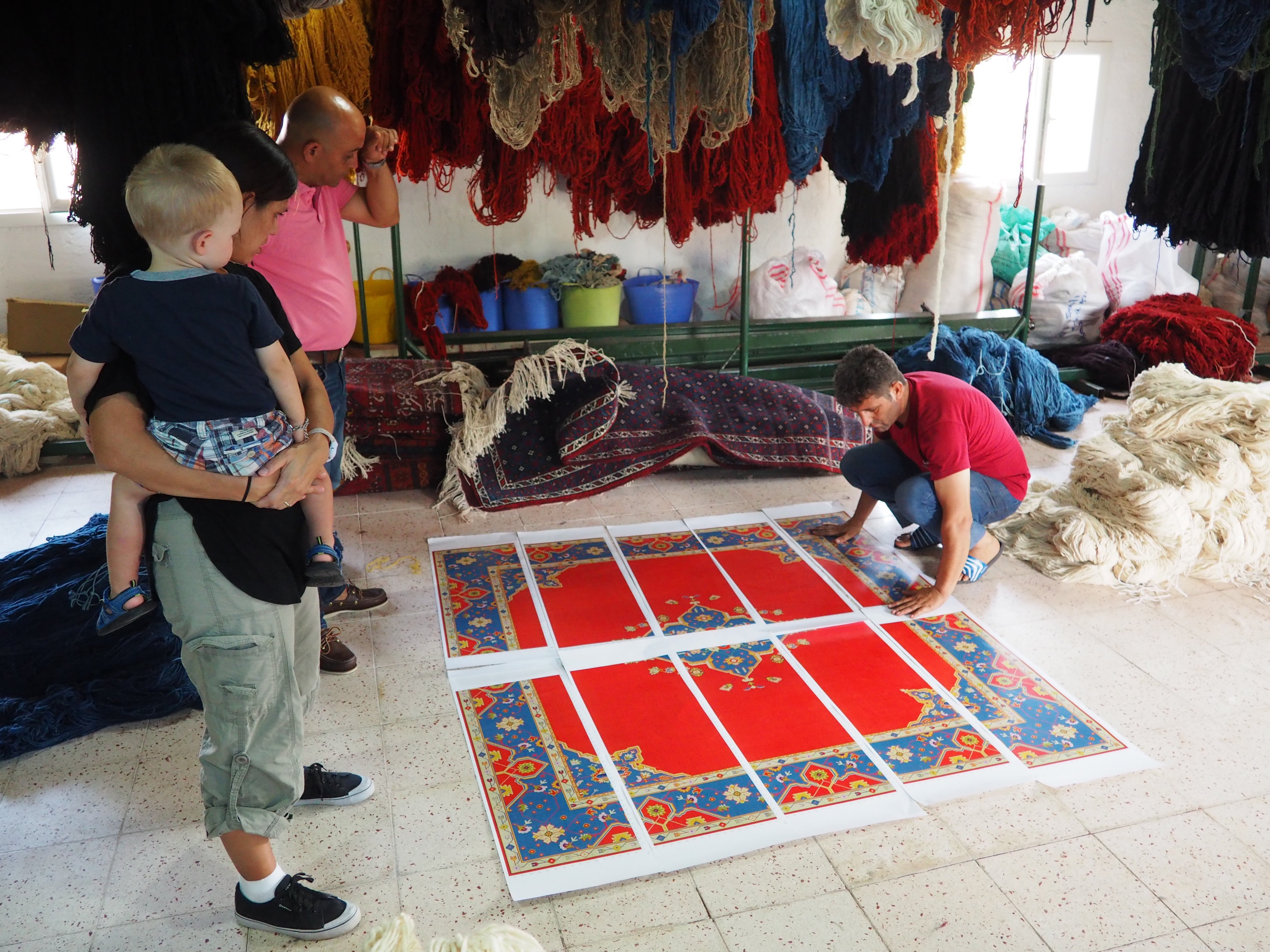 Tia learning how this Turkish rug company puts all 10 pattern papers together to make one huge rug in Ephesus, Turkey