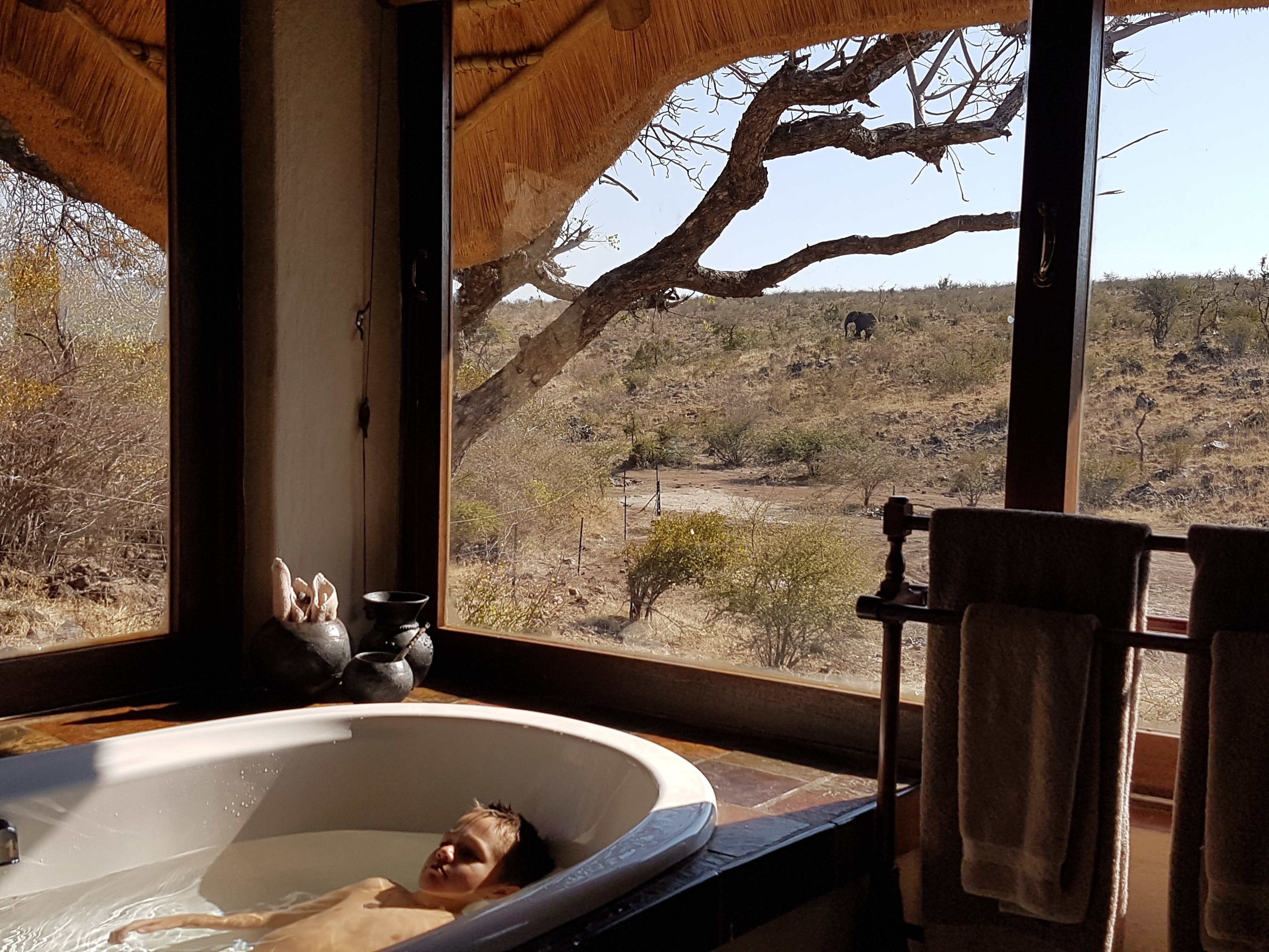 While Mason was taking a bath, a elephant came into view at Tuningi Lodge
