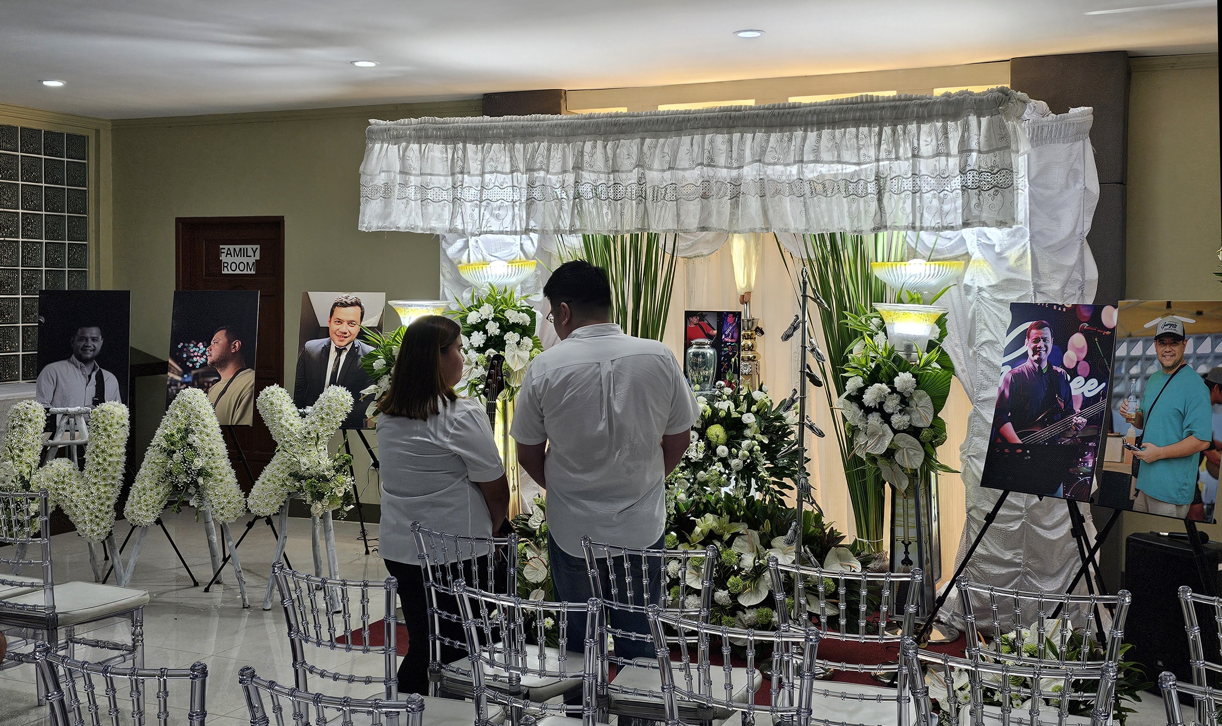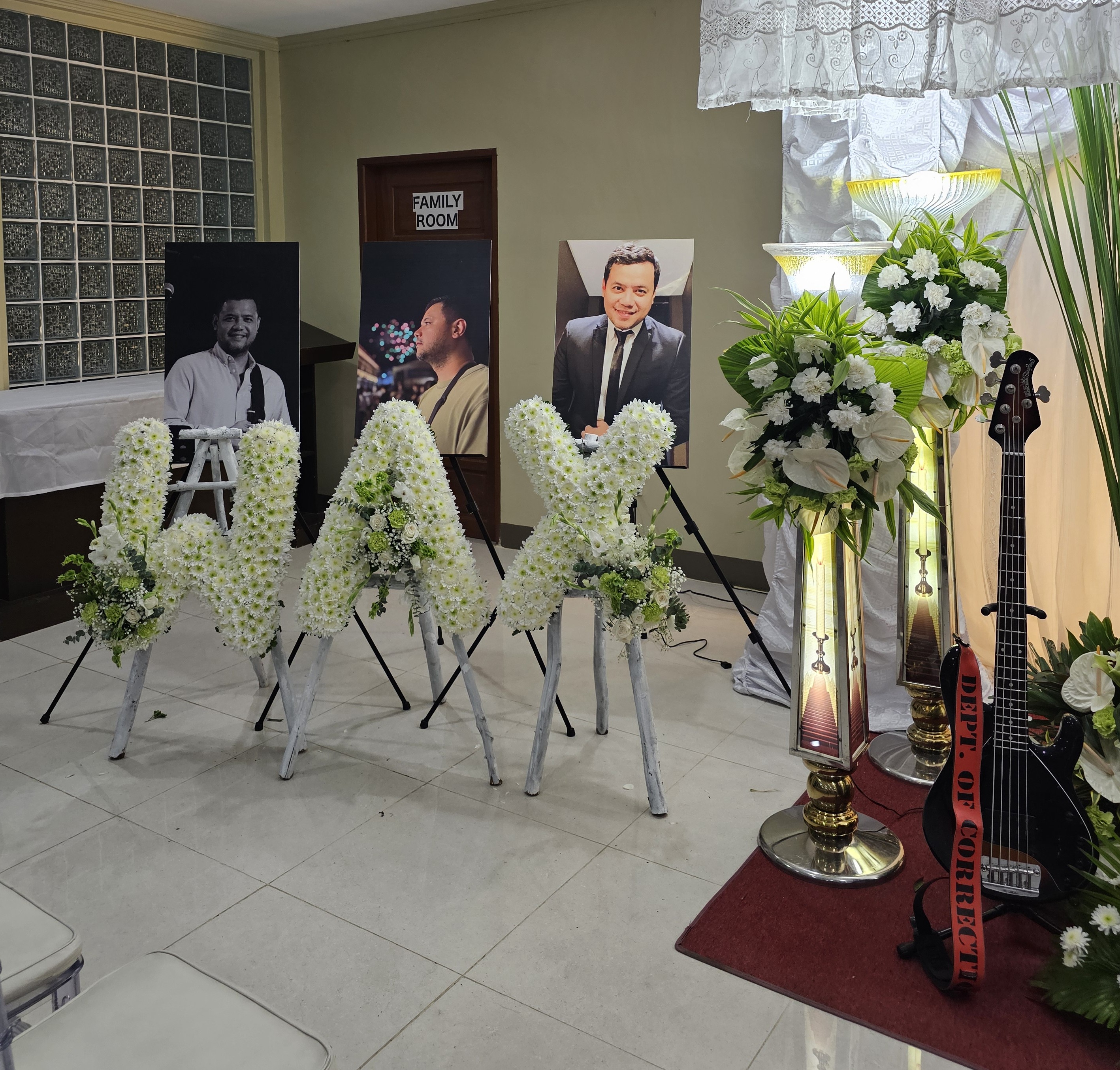 Paying respect at a funeral service with floral tributes and portraits honoring Wax.