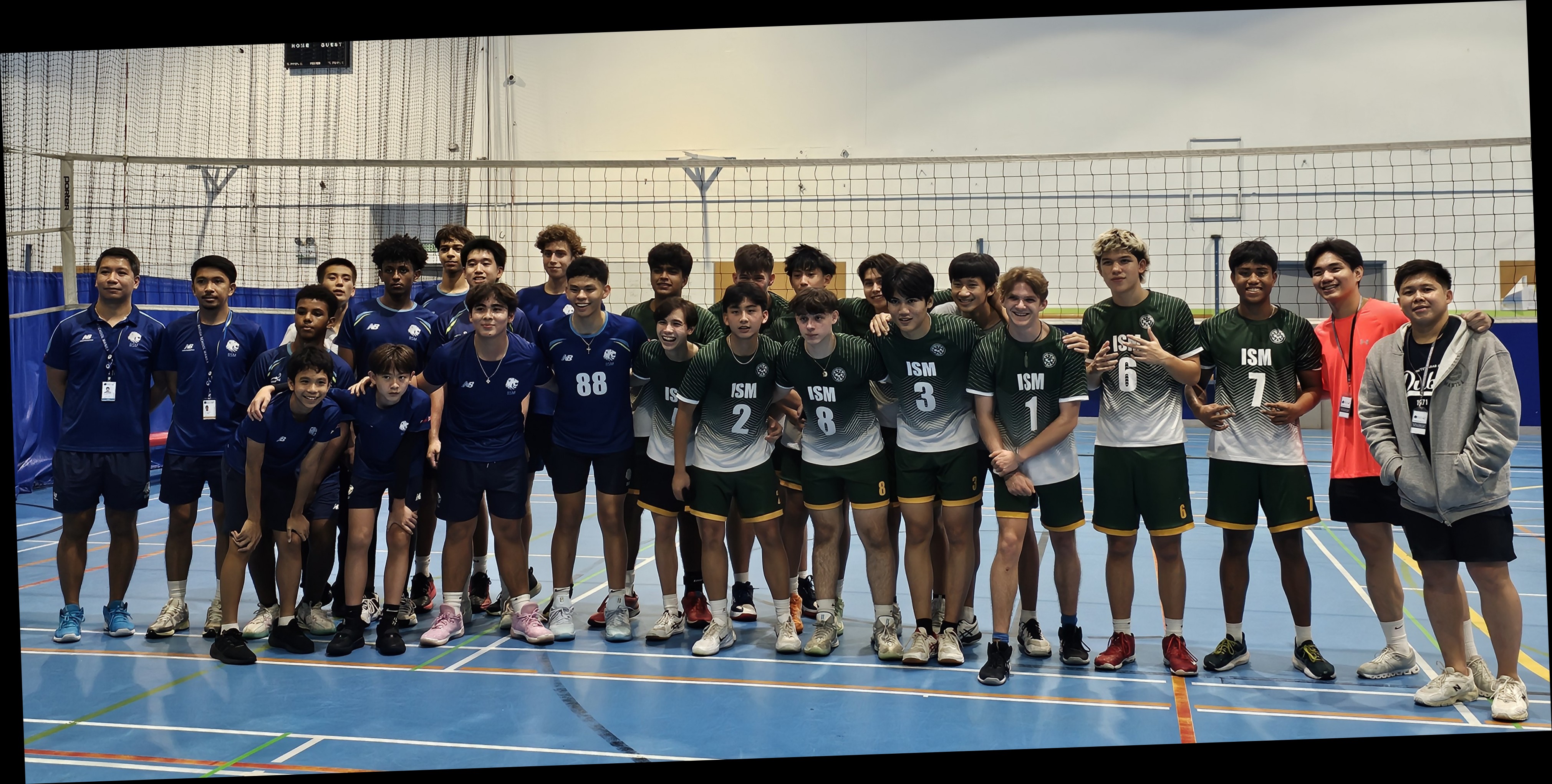 BSM & ISM volleyball teams gather for a group photo after the match in the gym.