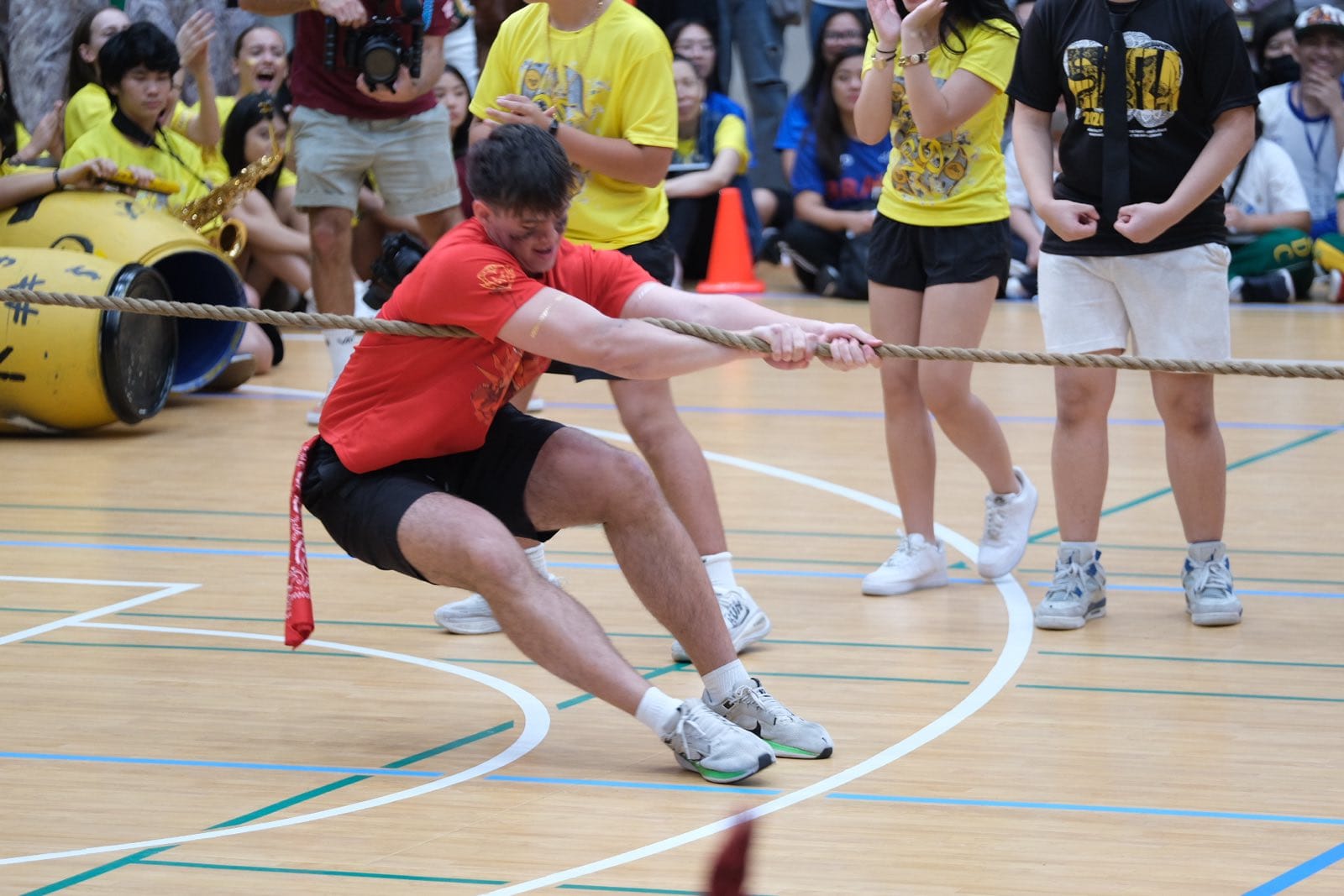 Mason one armed pulling in the tug-of-war competition during Battle of the Bearcats...his team won