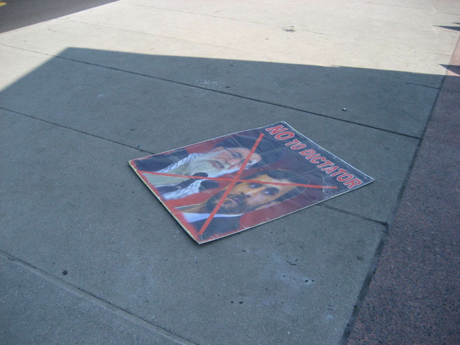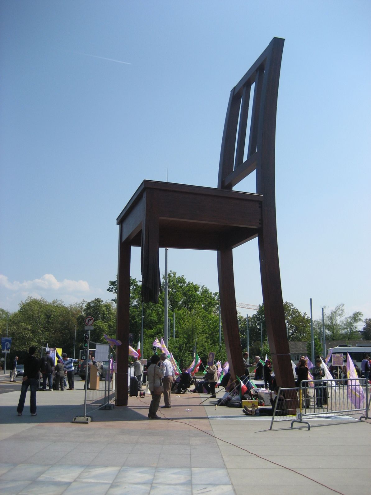 Broken chair out front of the United Nations...symbolises opposition to land mines and cluster bombs