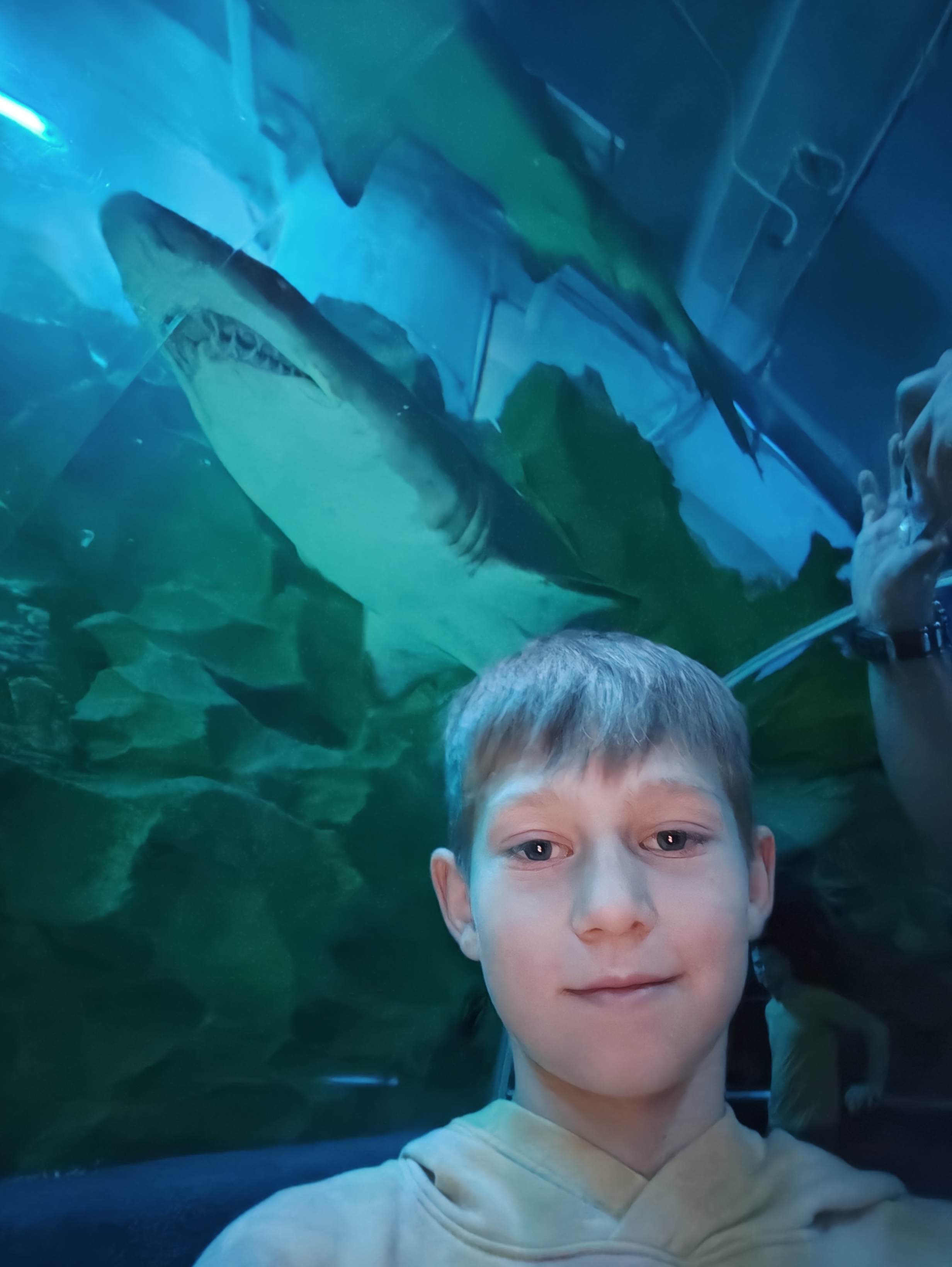 Blake takes a selfie with a shark swimming overhead at the aquarium in Kuala Lumpur