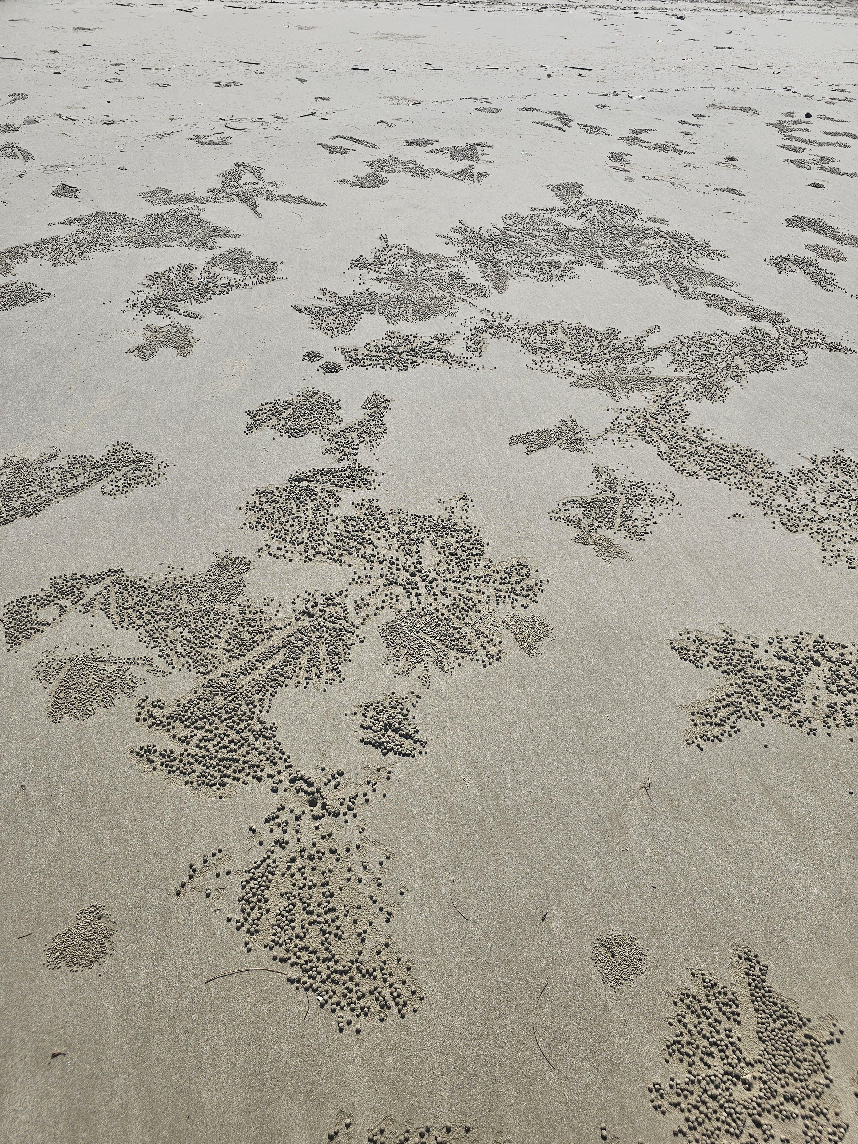 Intricate sand patterns created by crabs at the beach of the Shangri-la Hotel