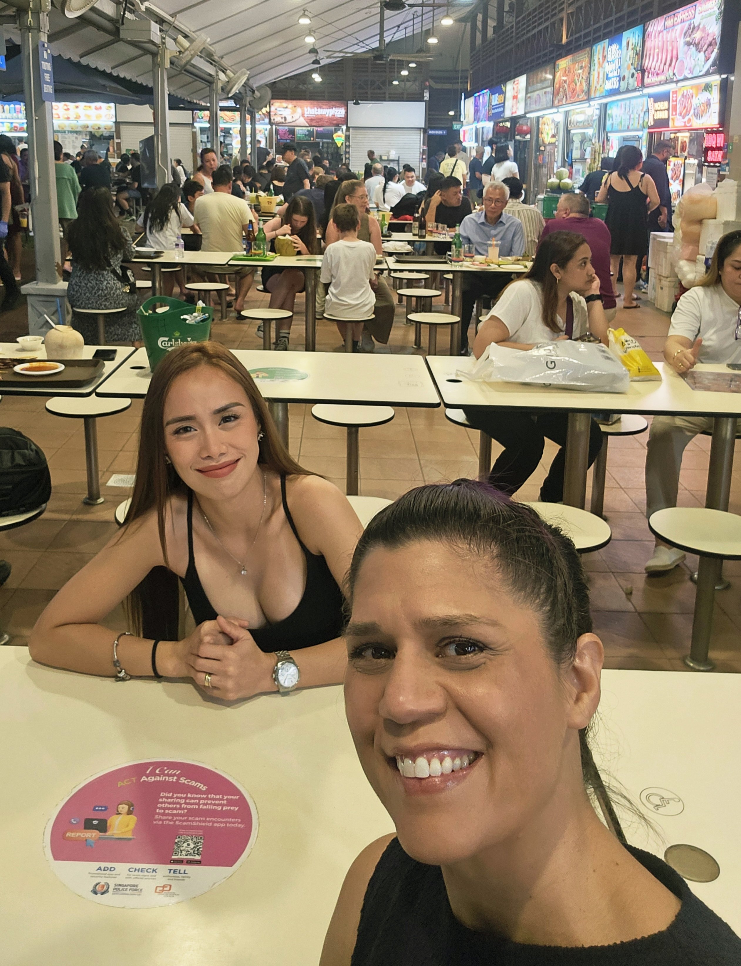 Tia and Nina waiting for the guys to come back with our food at this Singapore hawker centre.