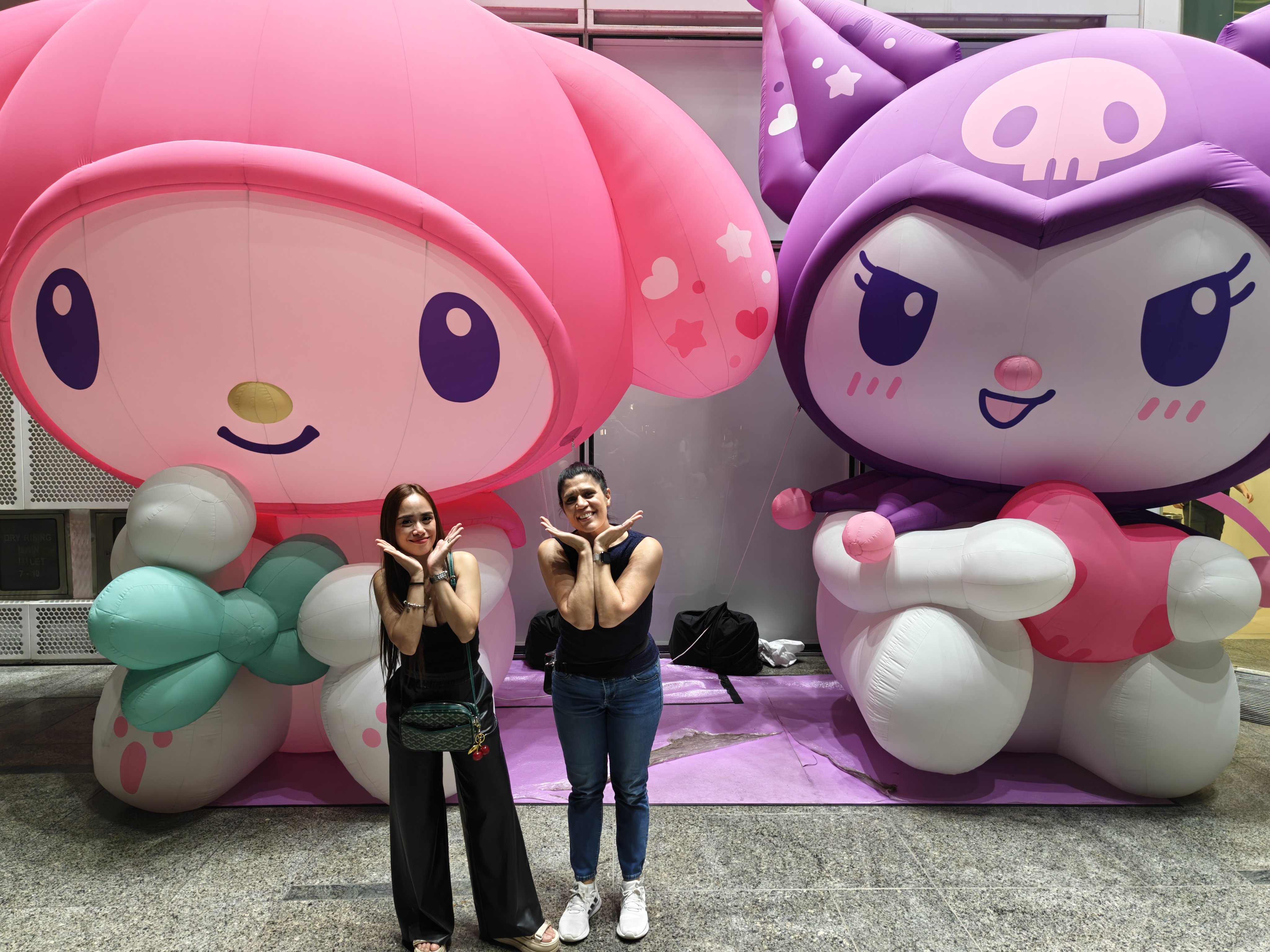 Nina loves Hello Kitty, so we had to pose in front of giant My Melody and Kuromi inflatables in Singapore.