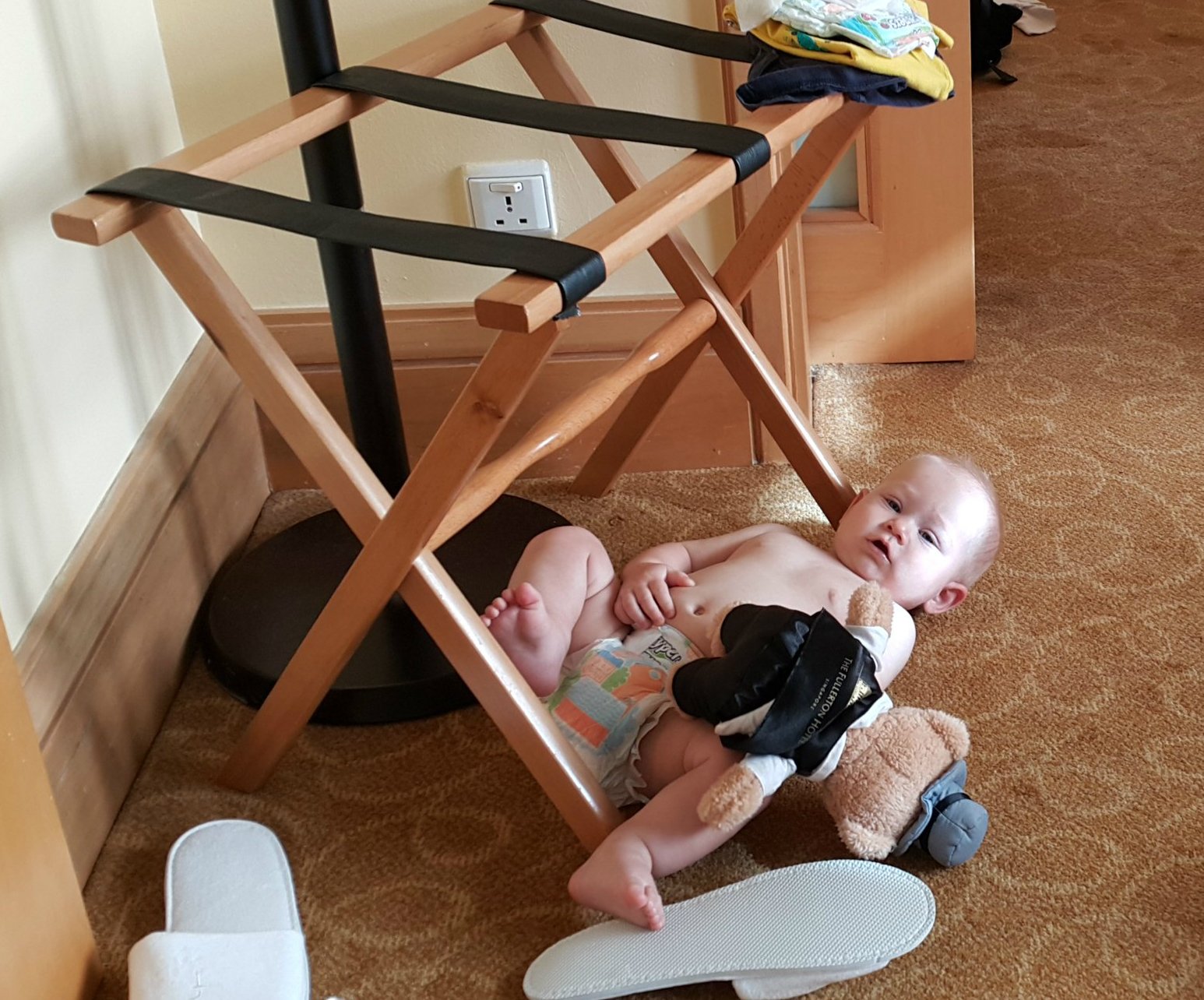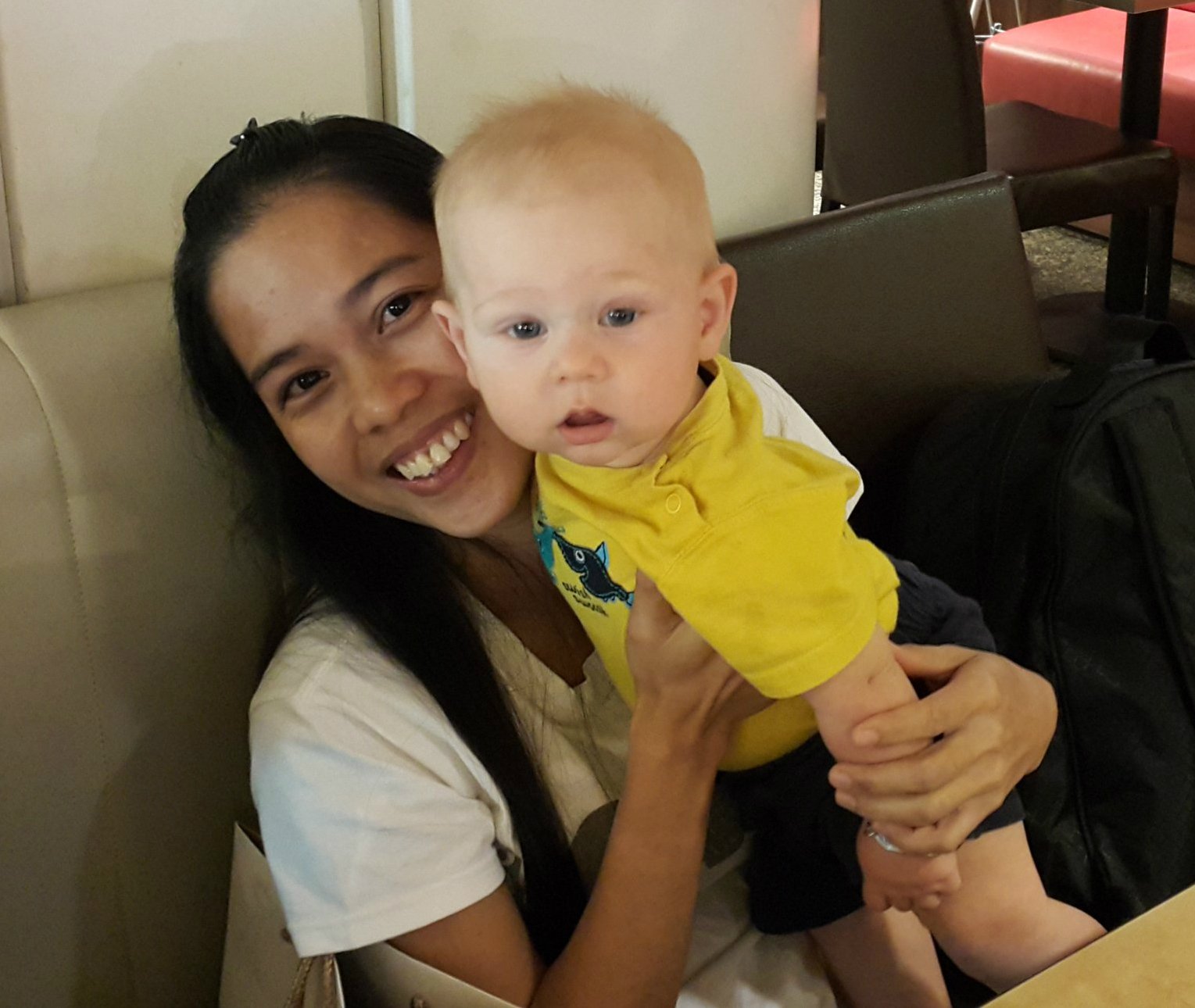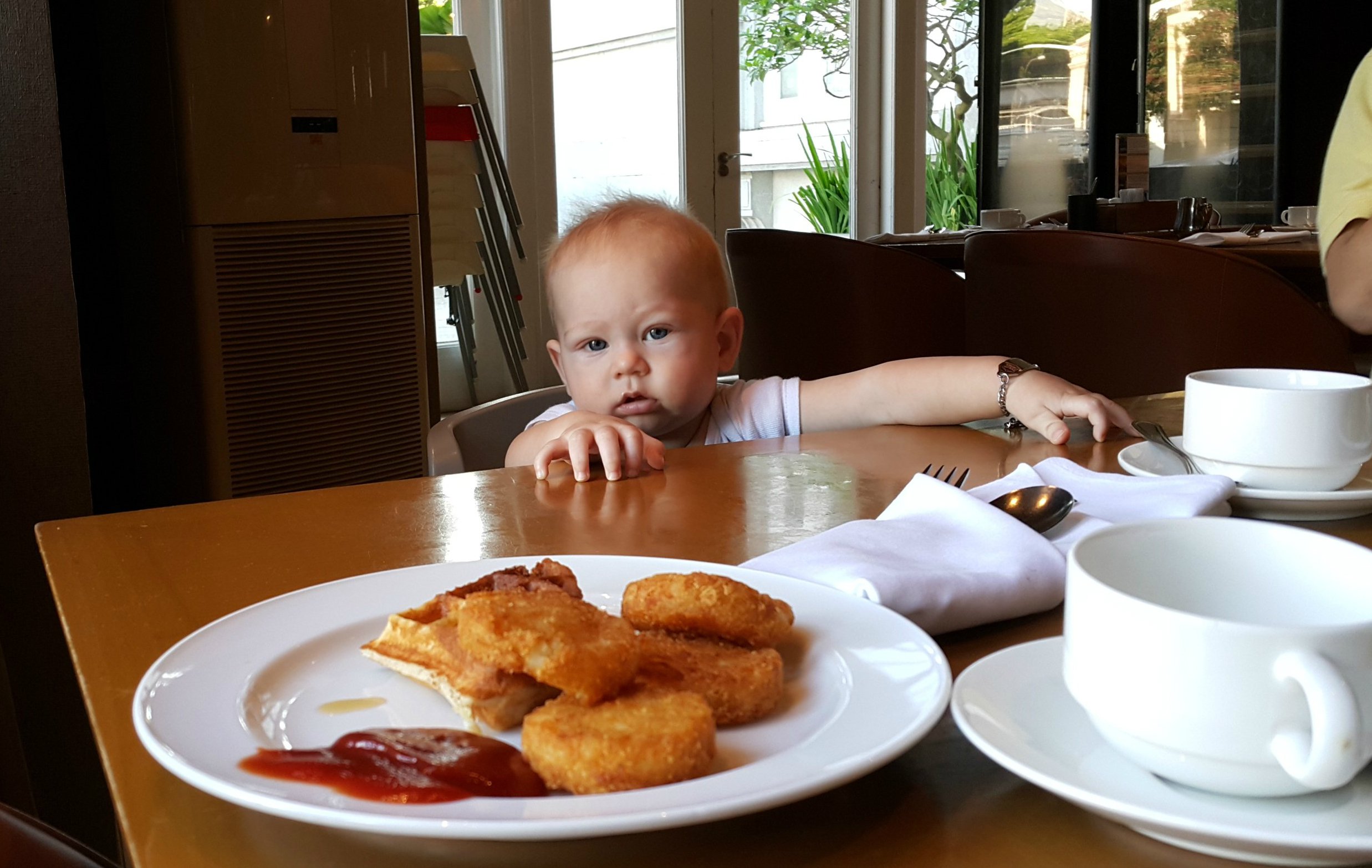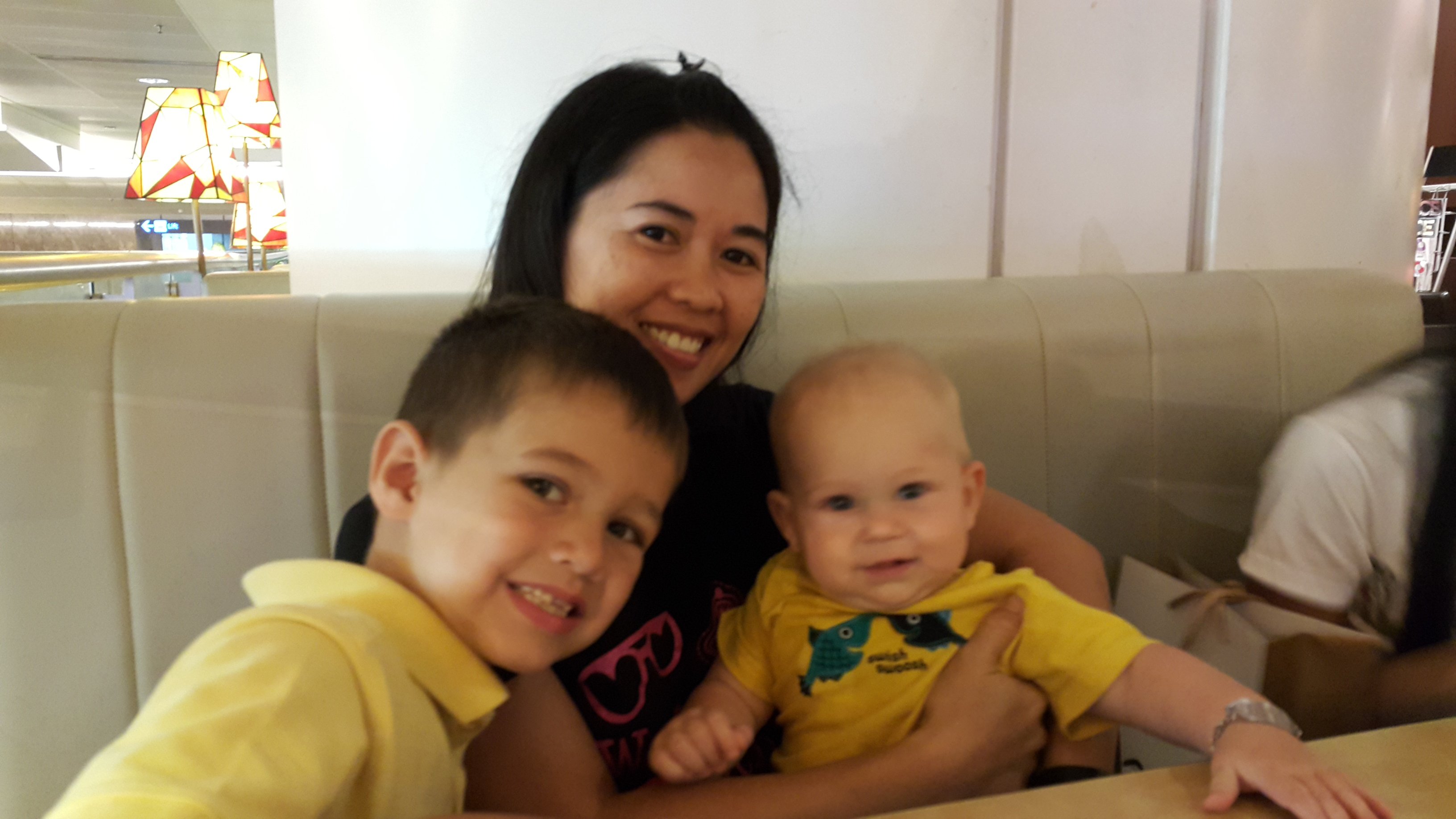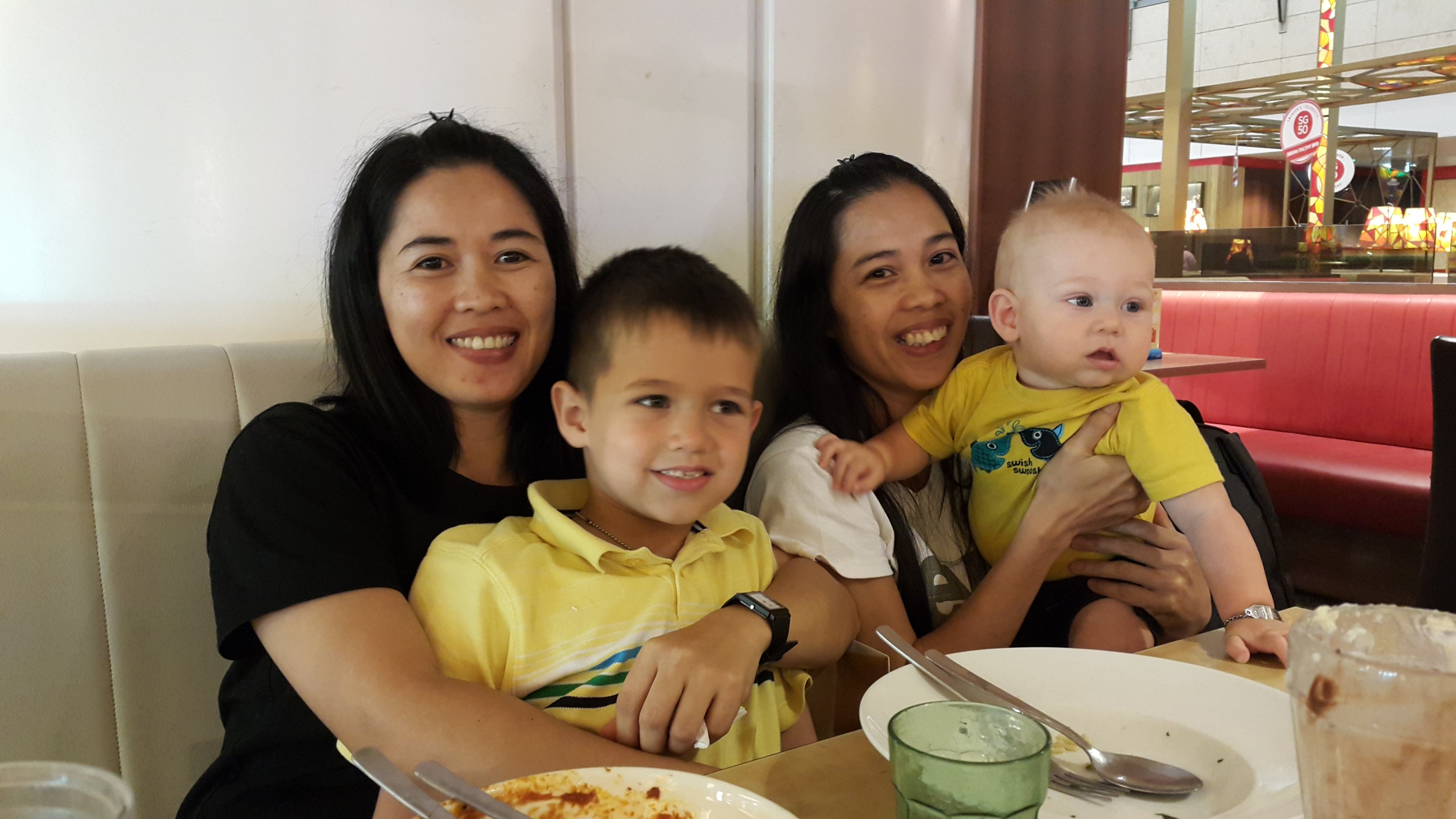 Sisters Honey & Janey play with Blake while we wait for our food and our flight at the airport