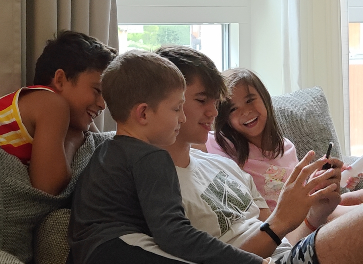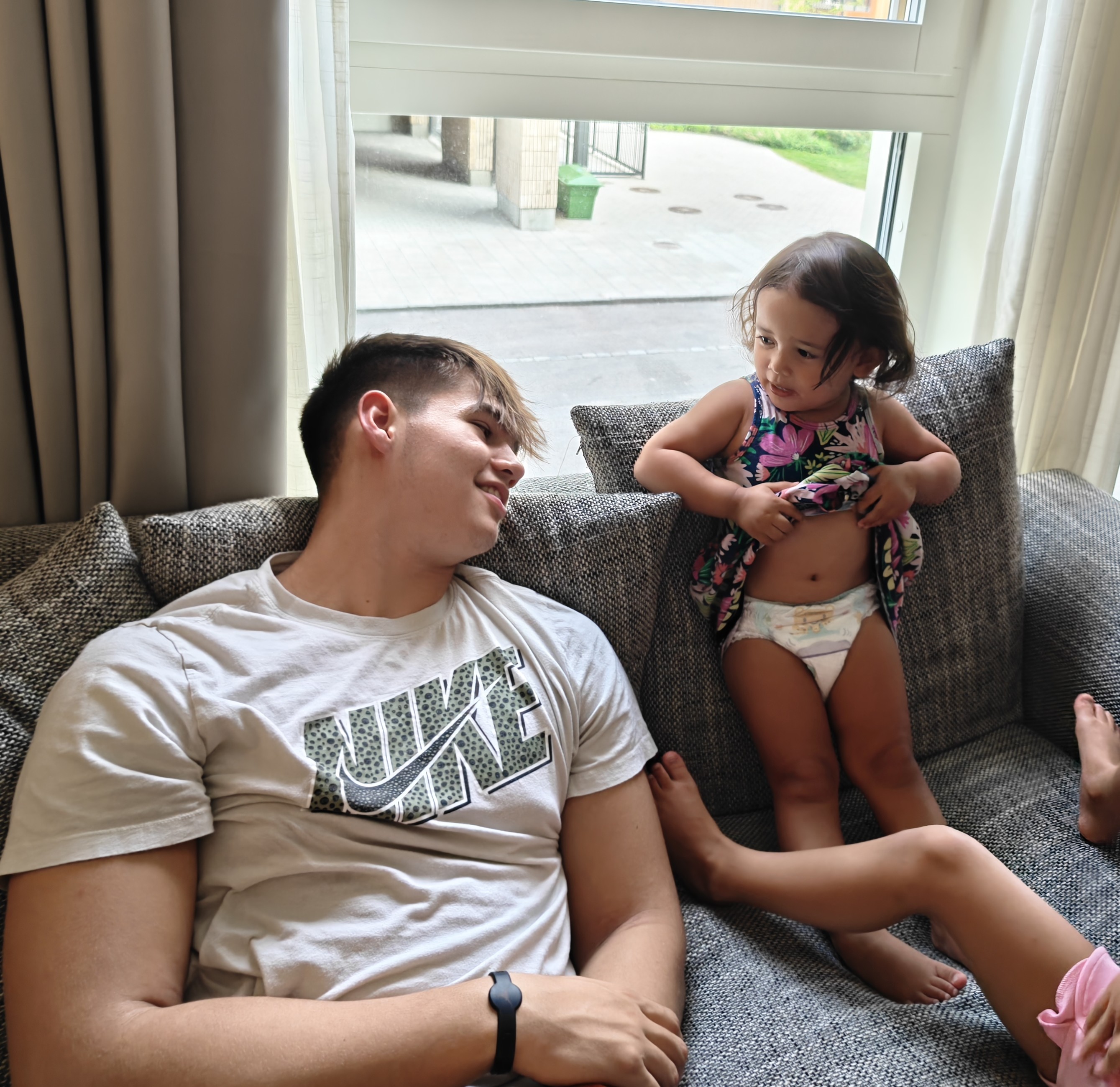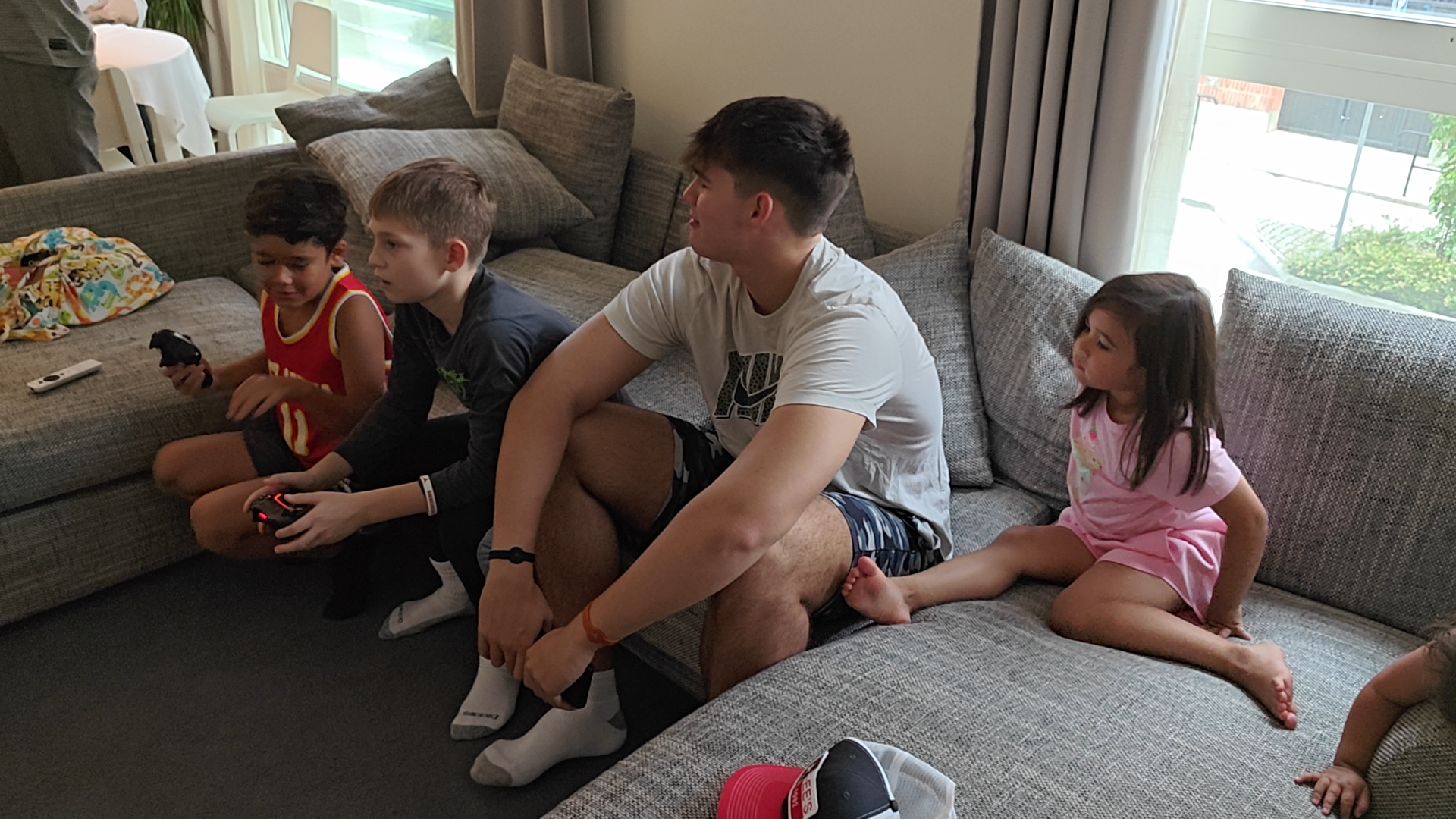Bonding on the couch playing video games together during our visit in Sweden.