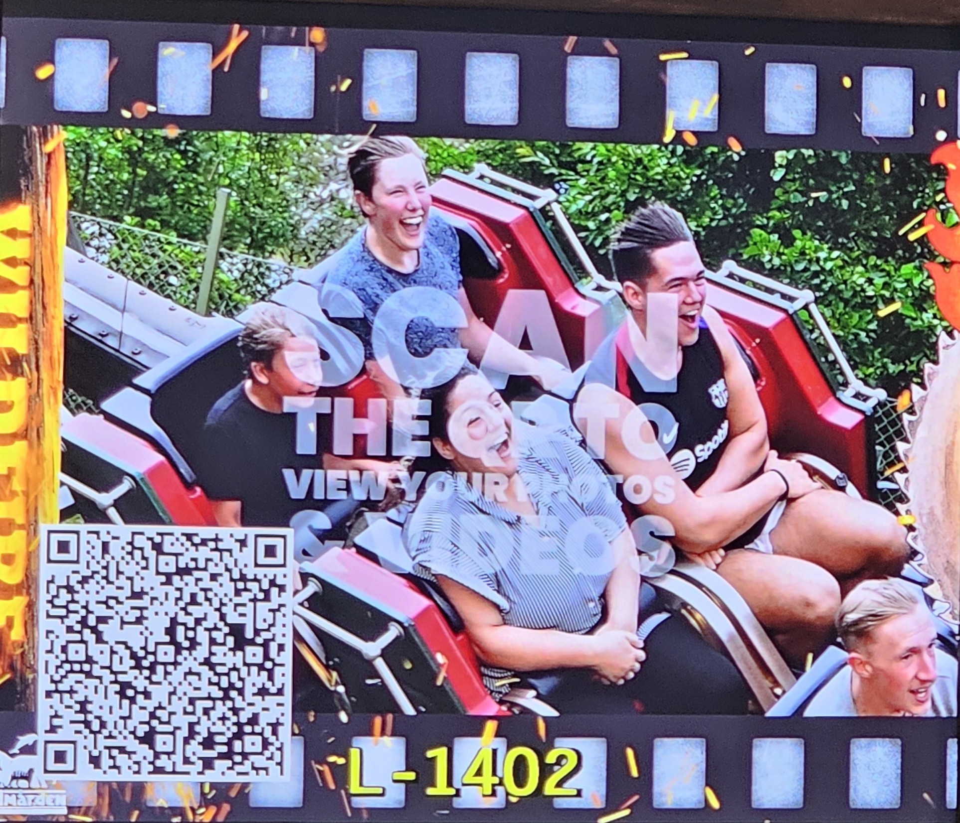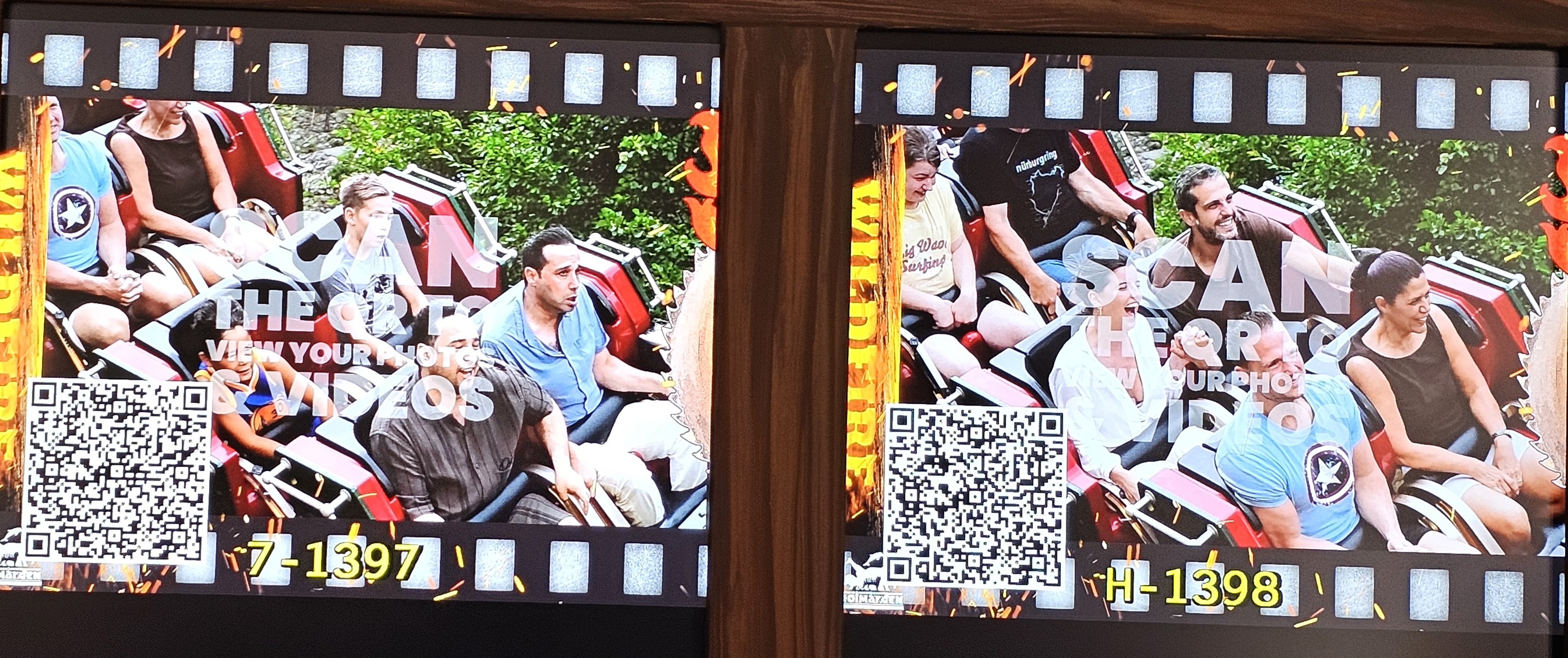 Photos of Christopher and Blake and then Matt & Tia riding a roller coaster, nearly everyone enjoying the thrill