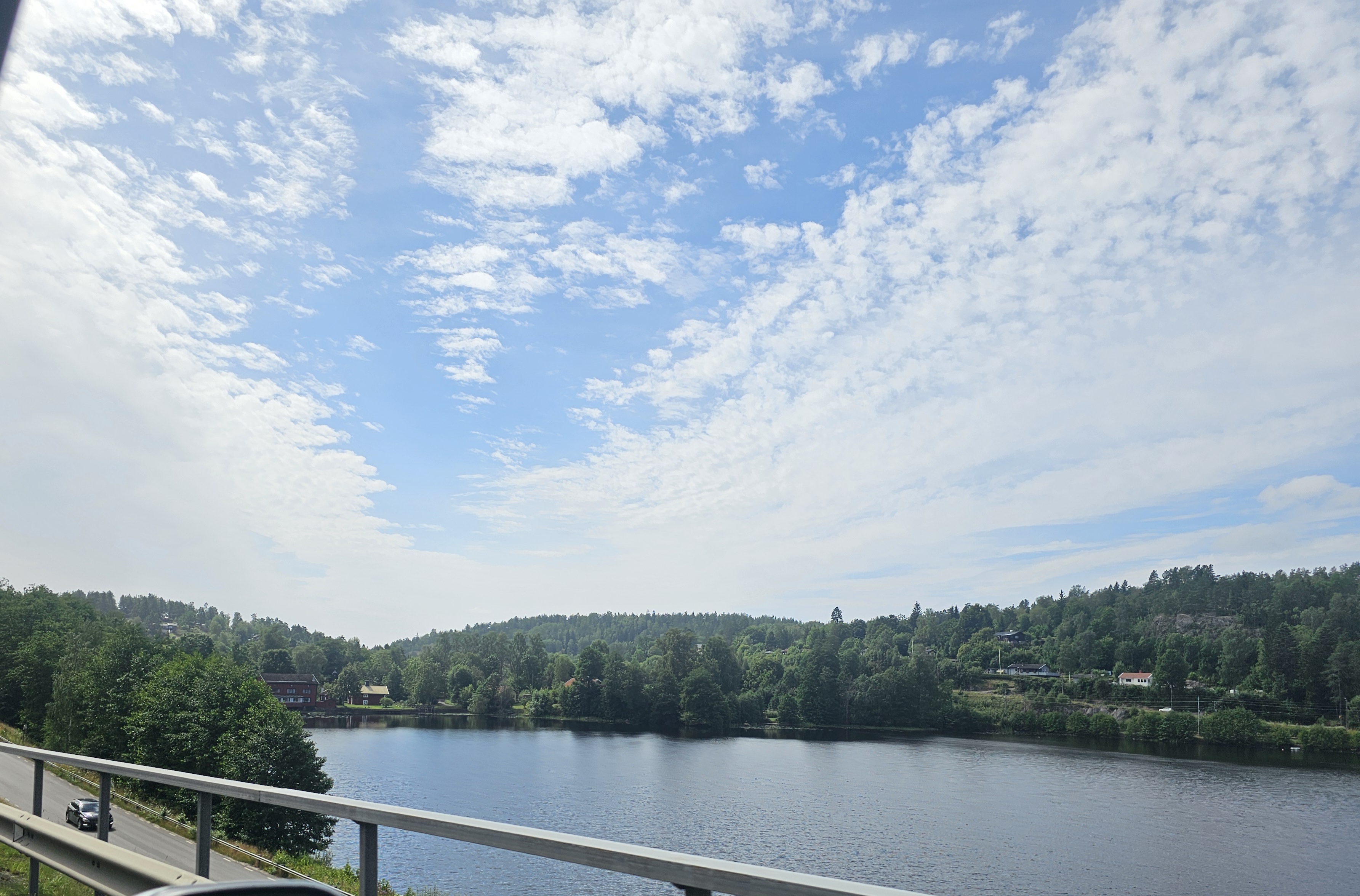 A peaceful view of a Swedish lake surrounded by lush green forests and houses under a summer sky