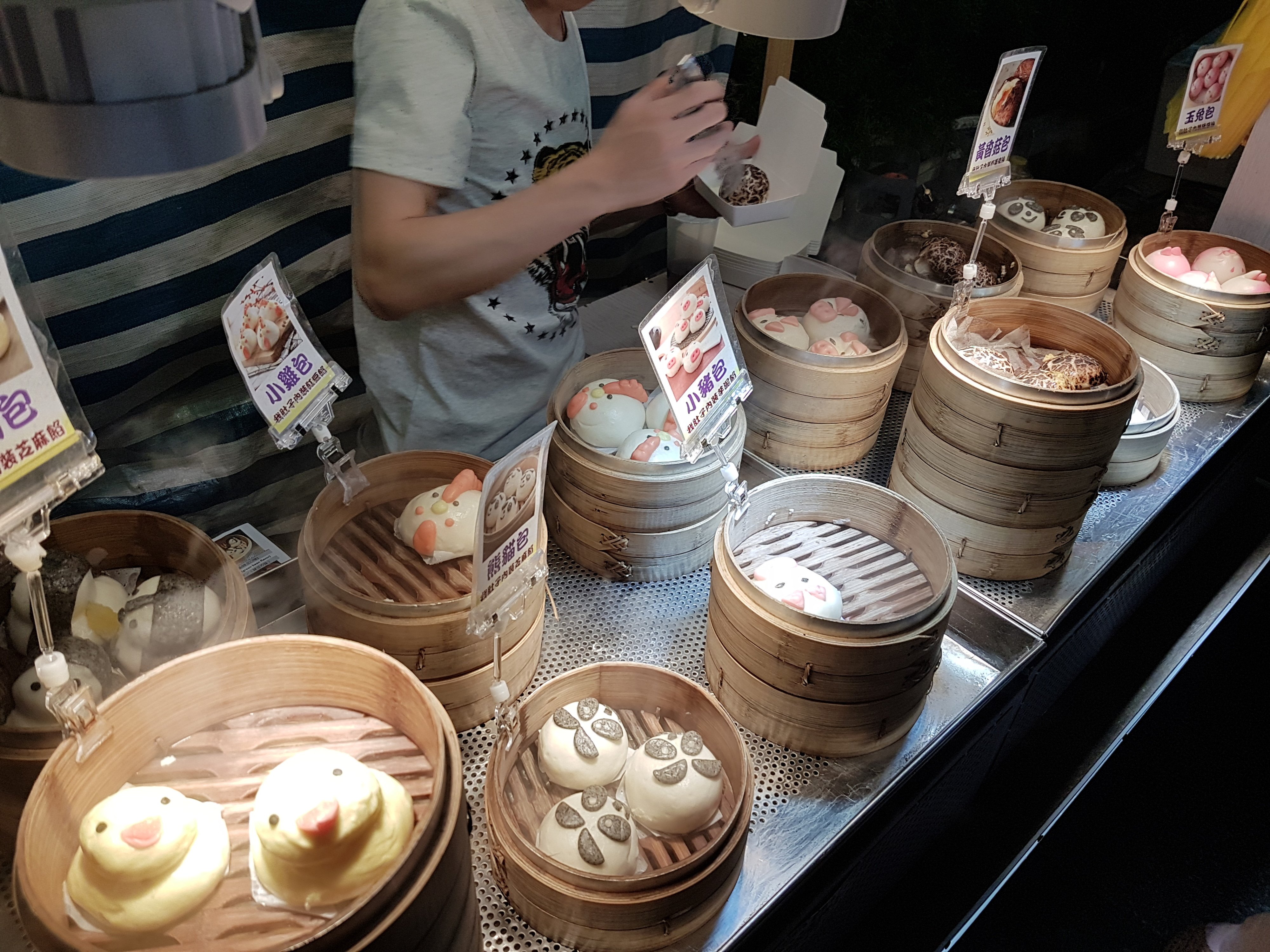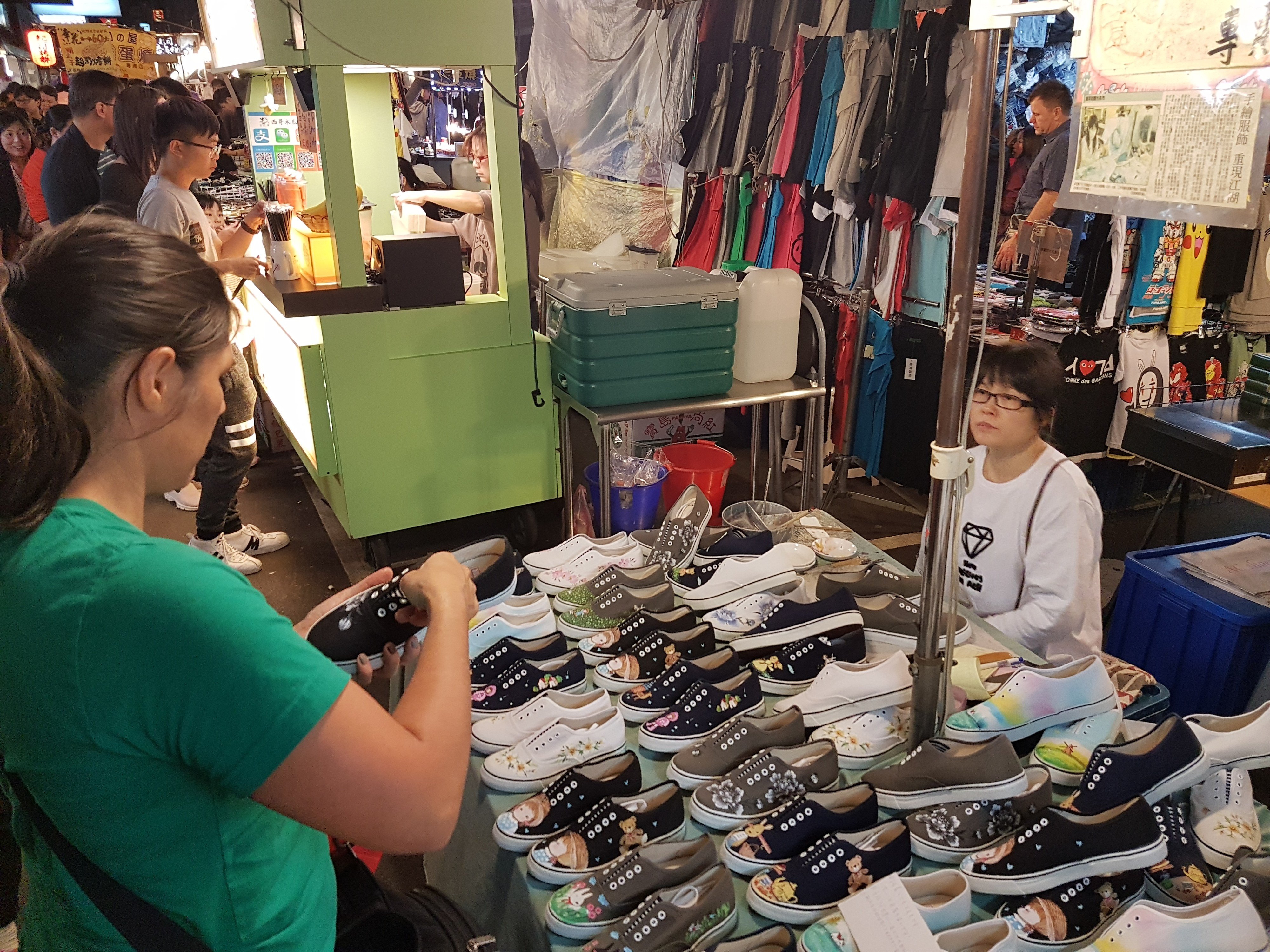 Tia checking out hand painted shoes at the night market in Taipei, Taiwan
