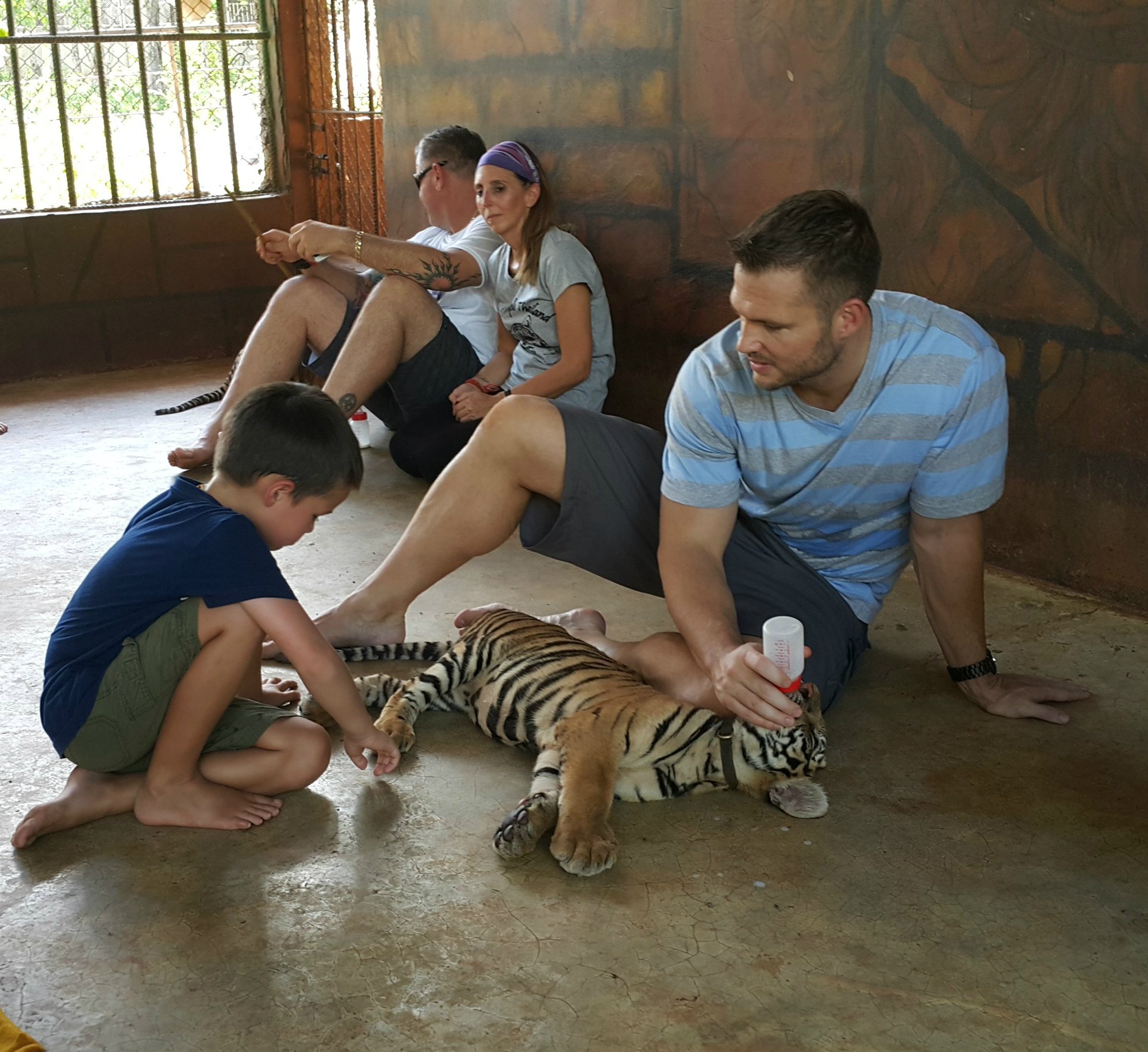 Boys feeding a tiger cub