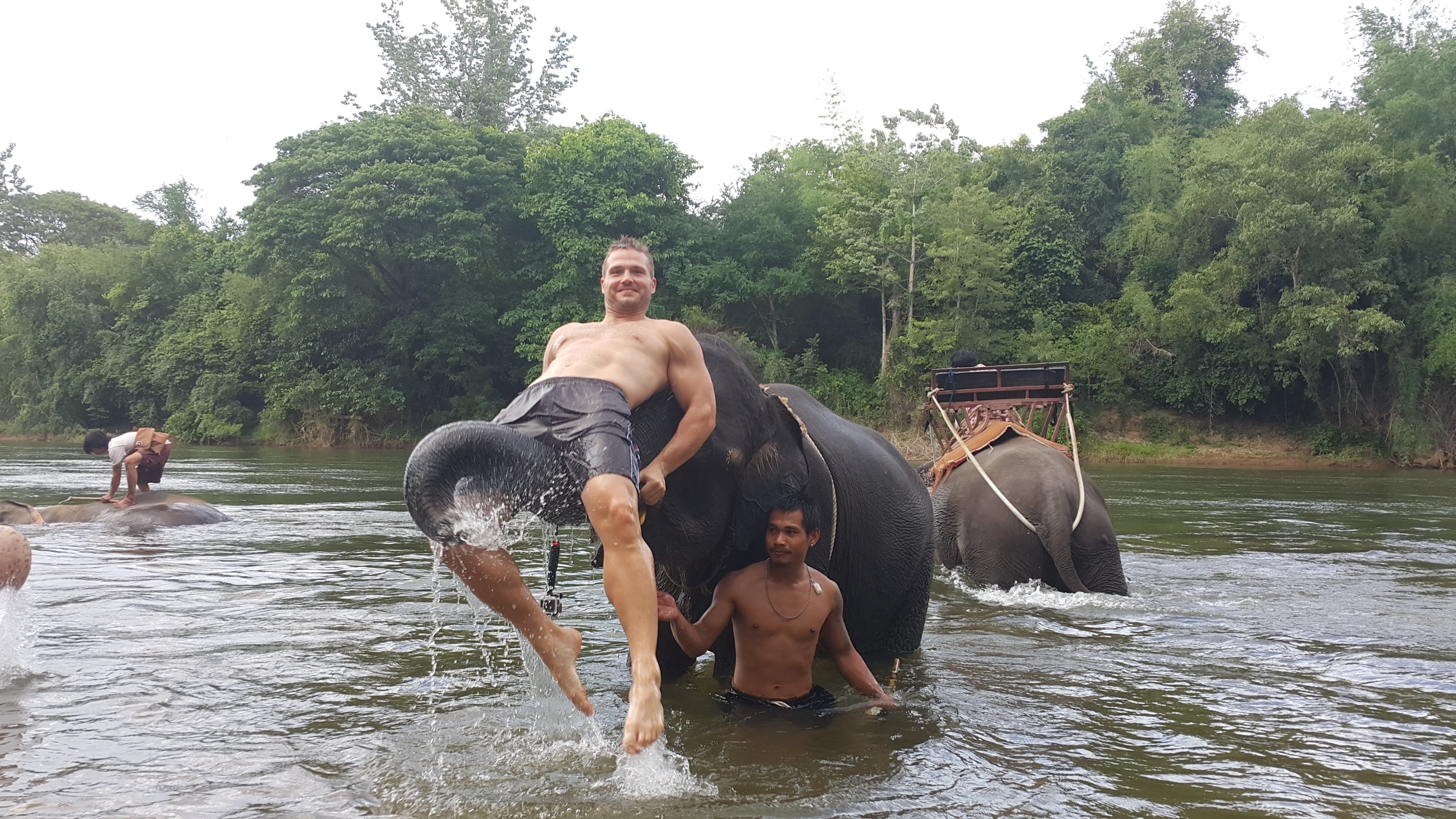Matt being lifted up by an elephant