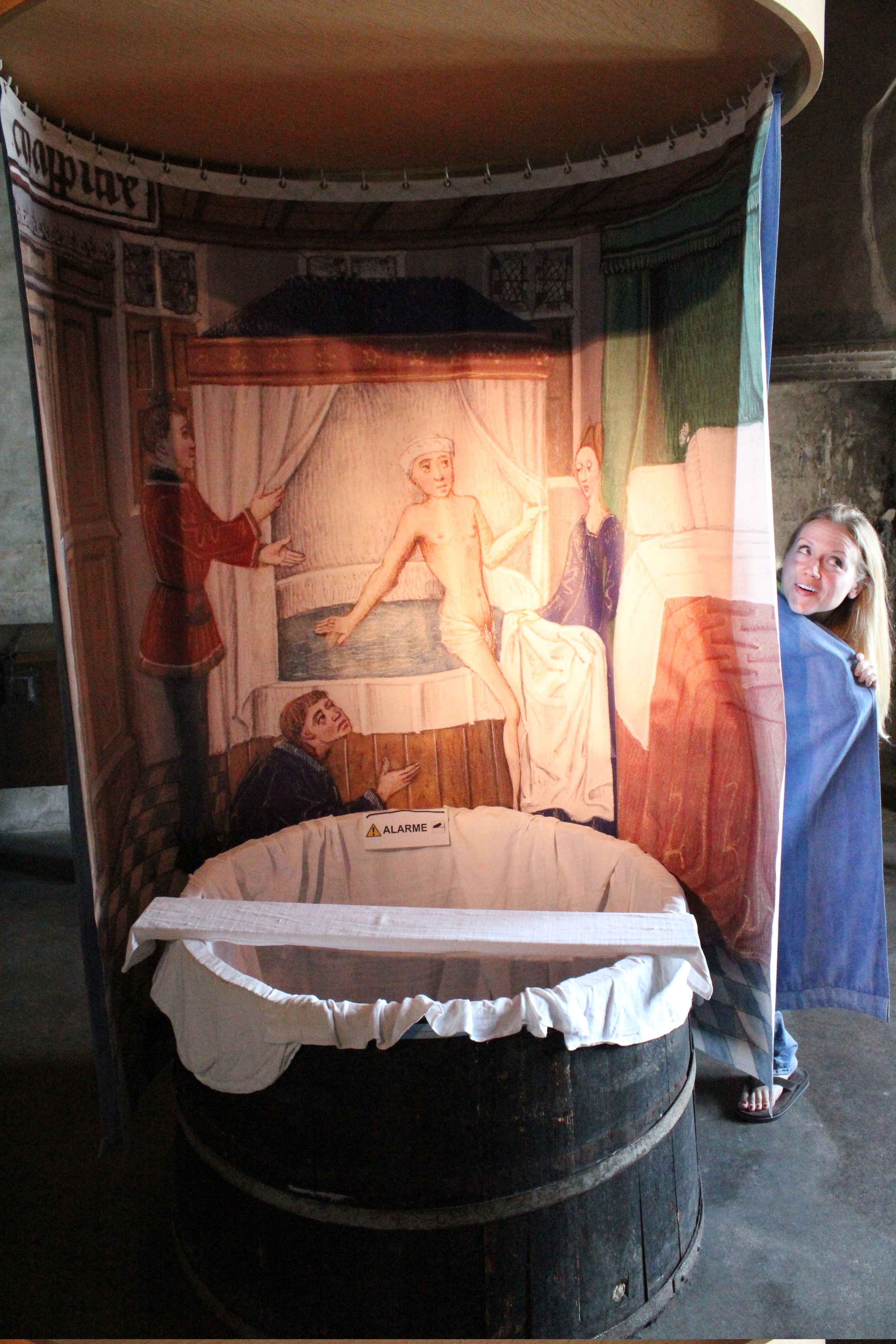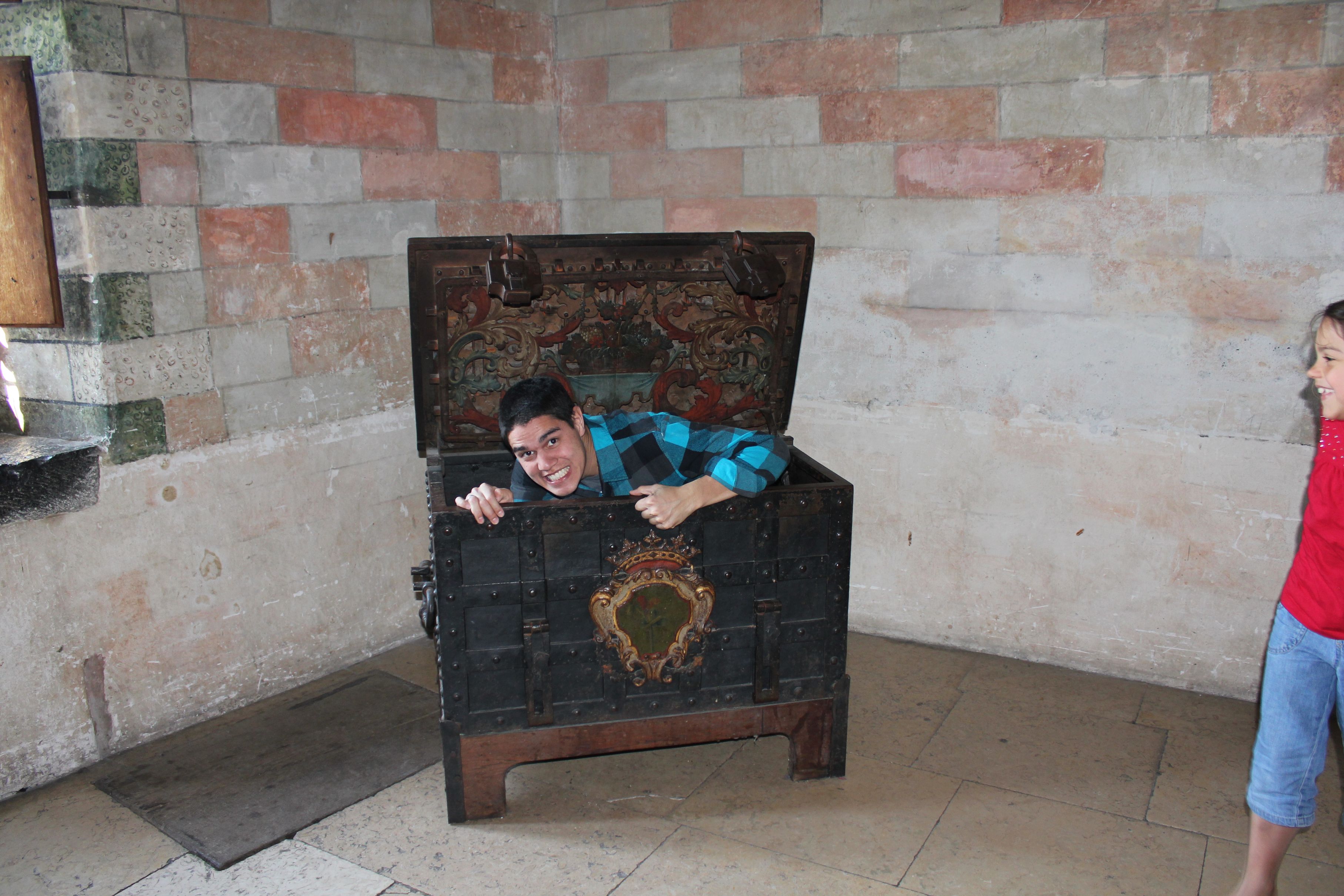 Robbie breaking the rules and getting into a chest at Chillon castle