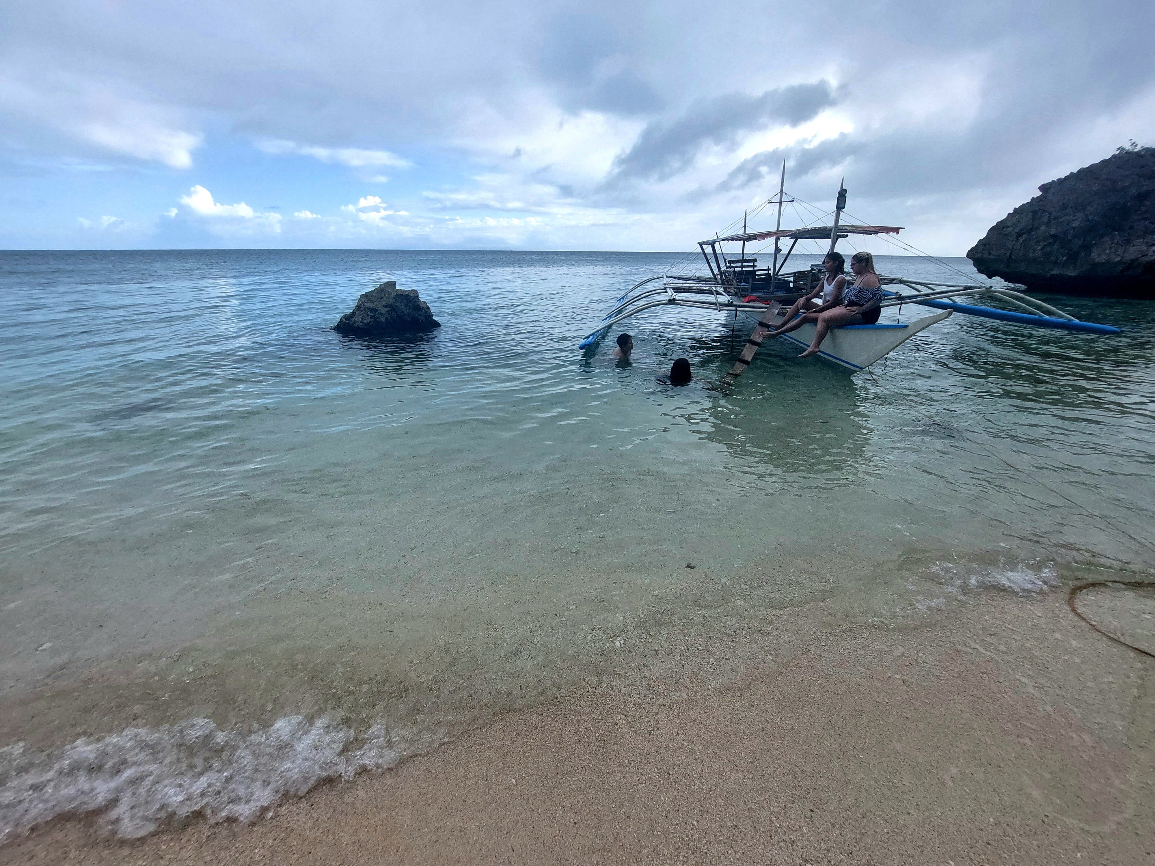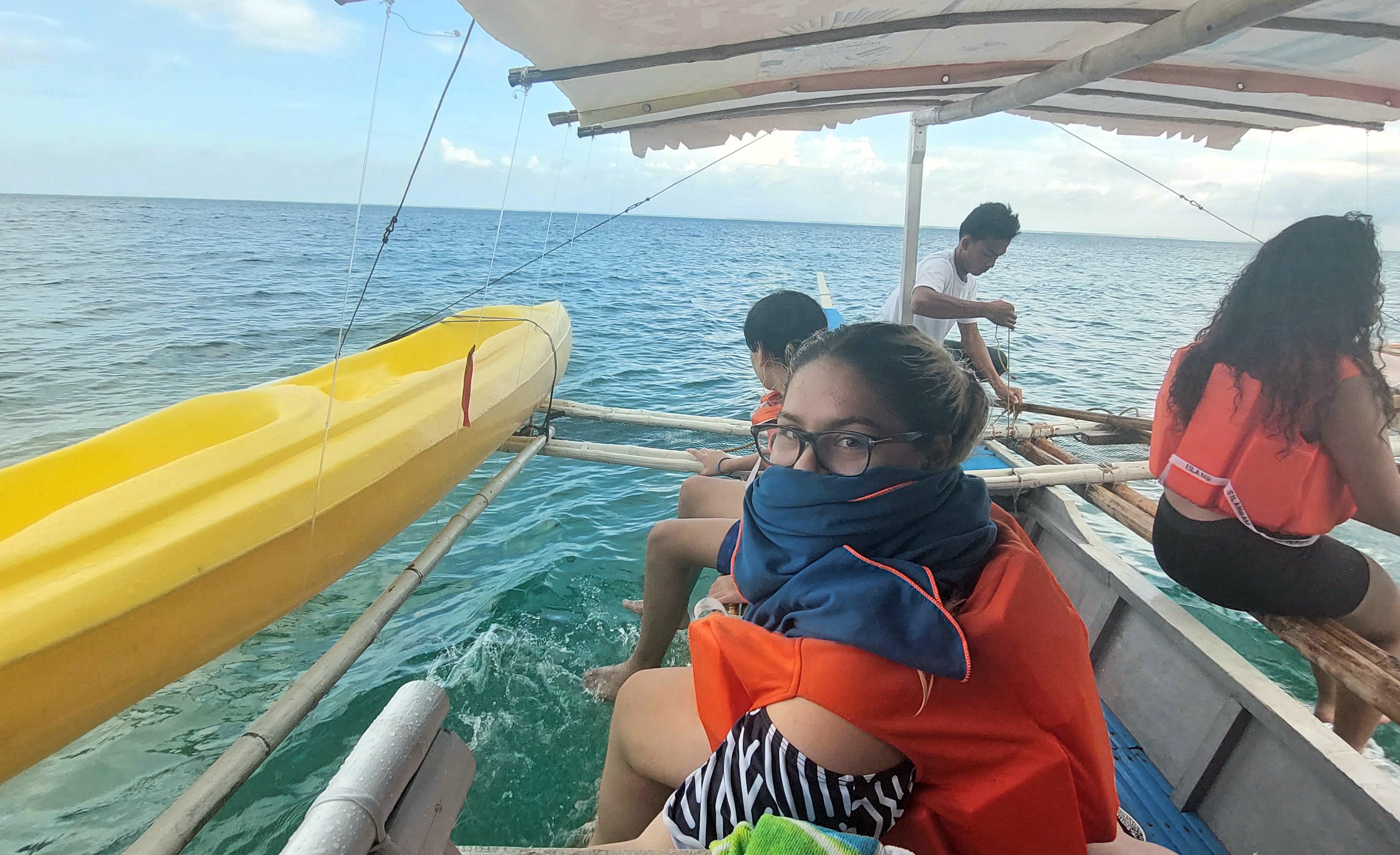 Enjoying a quiet moment on the outrigger boat while others swim in the clear Philippine waters