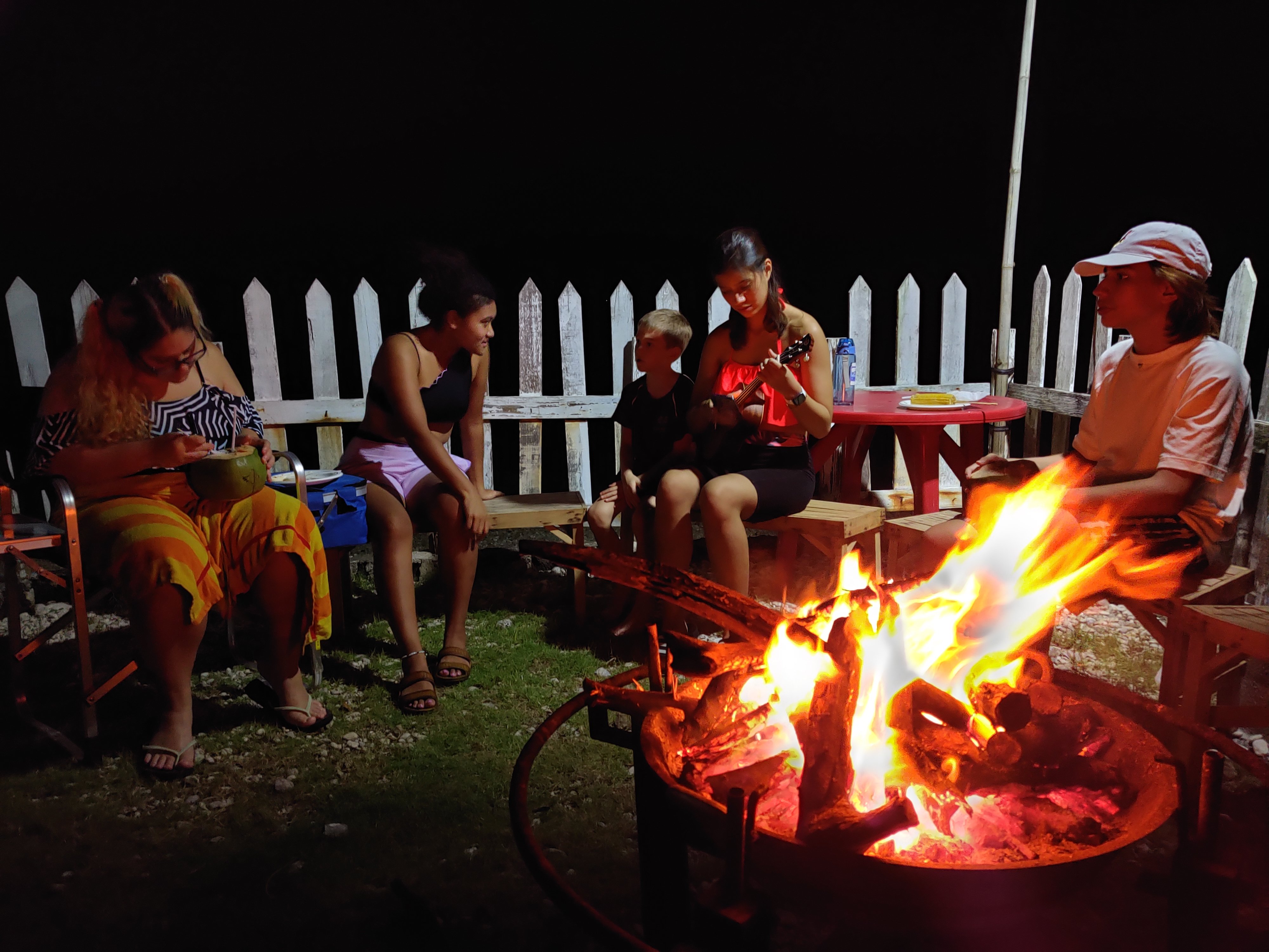 Kalani, Jasmin, Blake, Janella, and Zach enjoying an evening by the campfire during their road trip in the Philippines