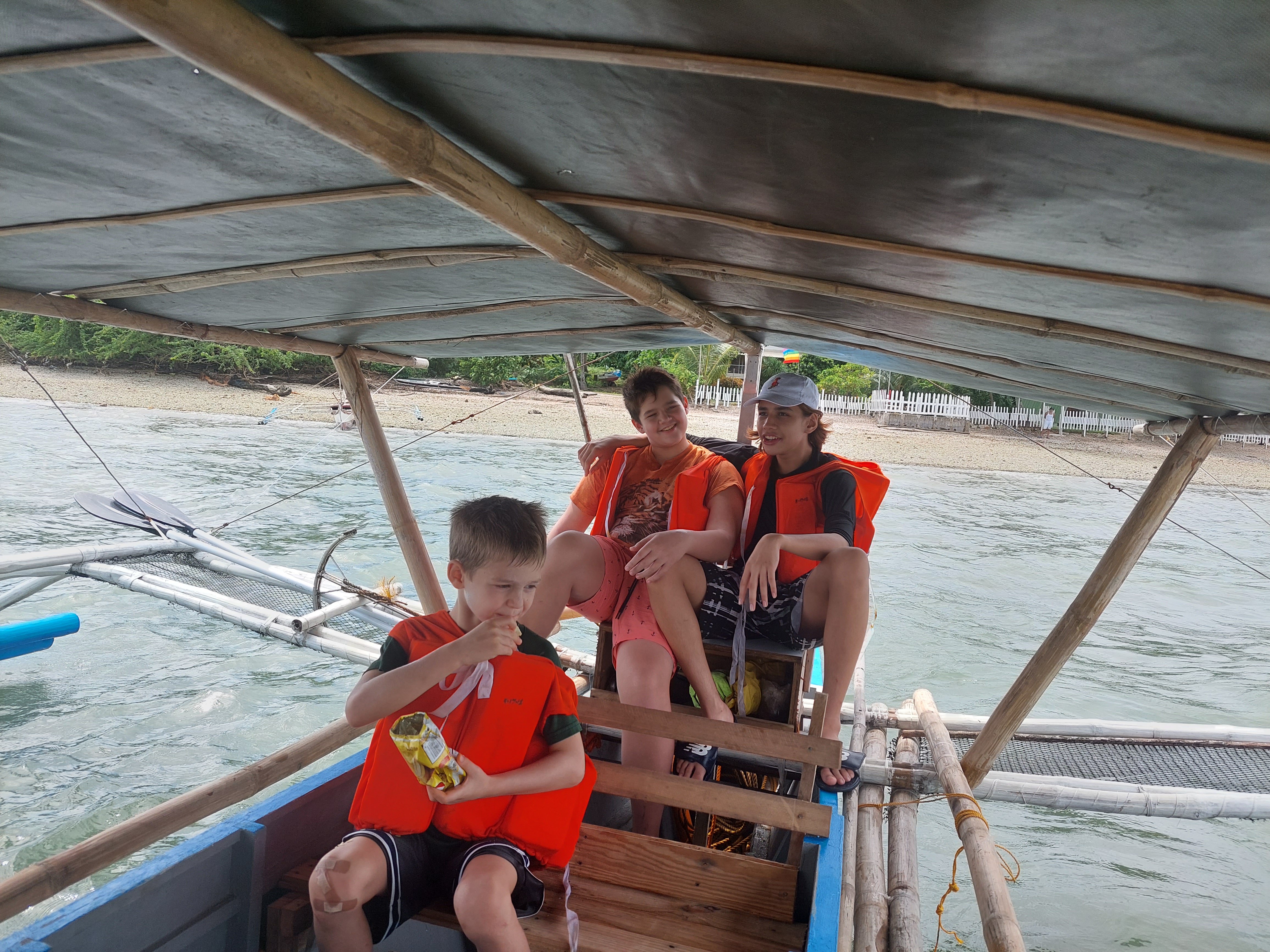 Blake, Mason, and Zach enjoying a boat ride to get to our Air BnB home during their Quezon and Laguna roadtrip in the Philippines