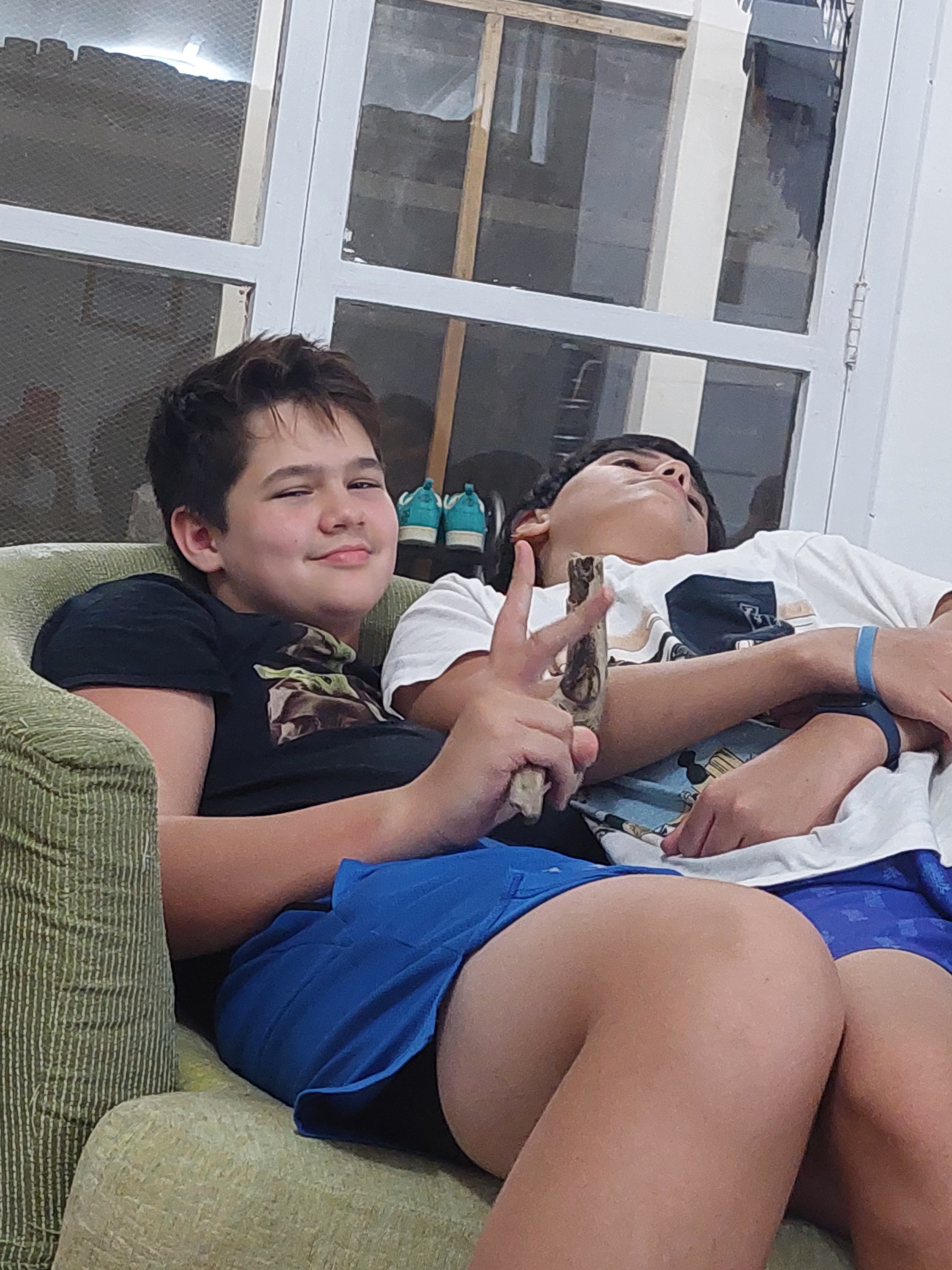 Mason and Jezreel relaxing on a couch during our Quezon and Laguna road trip