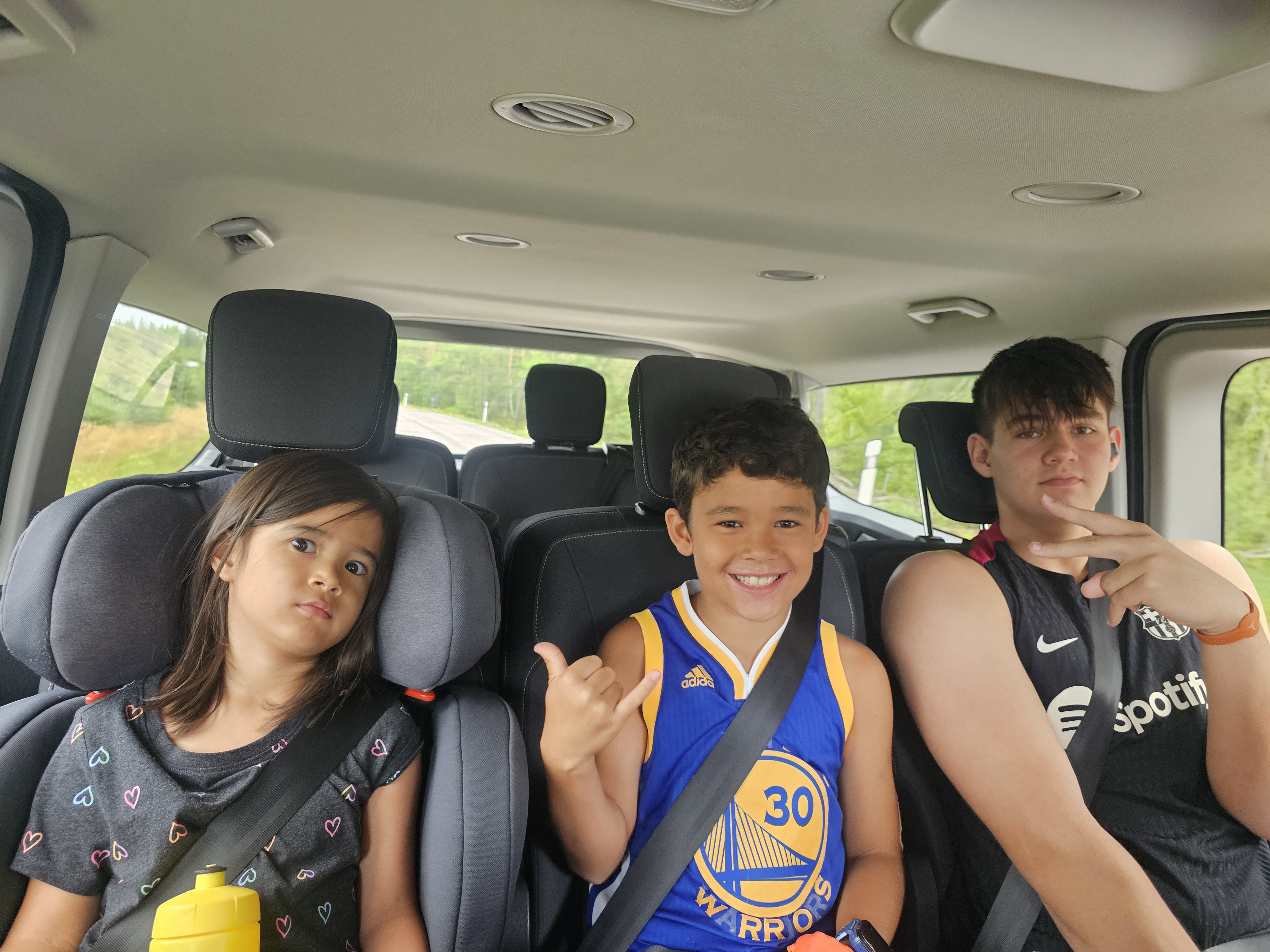 Mason with Christopher and Elina hopfully enjoying the road trip in Sweden during our vacation.