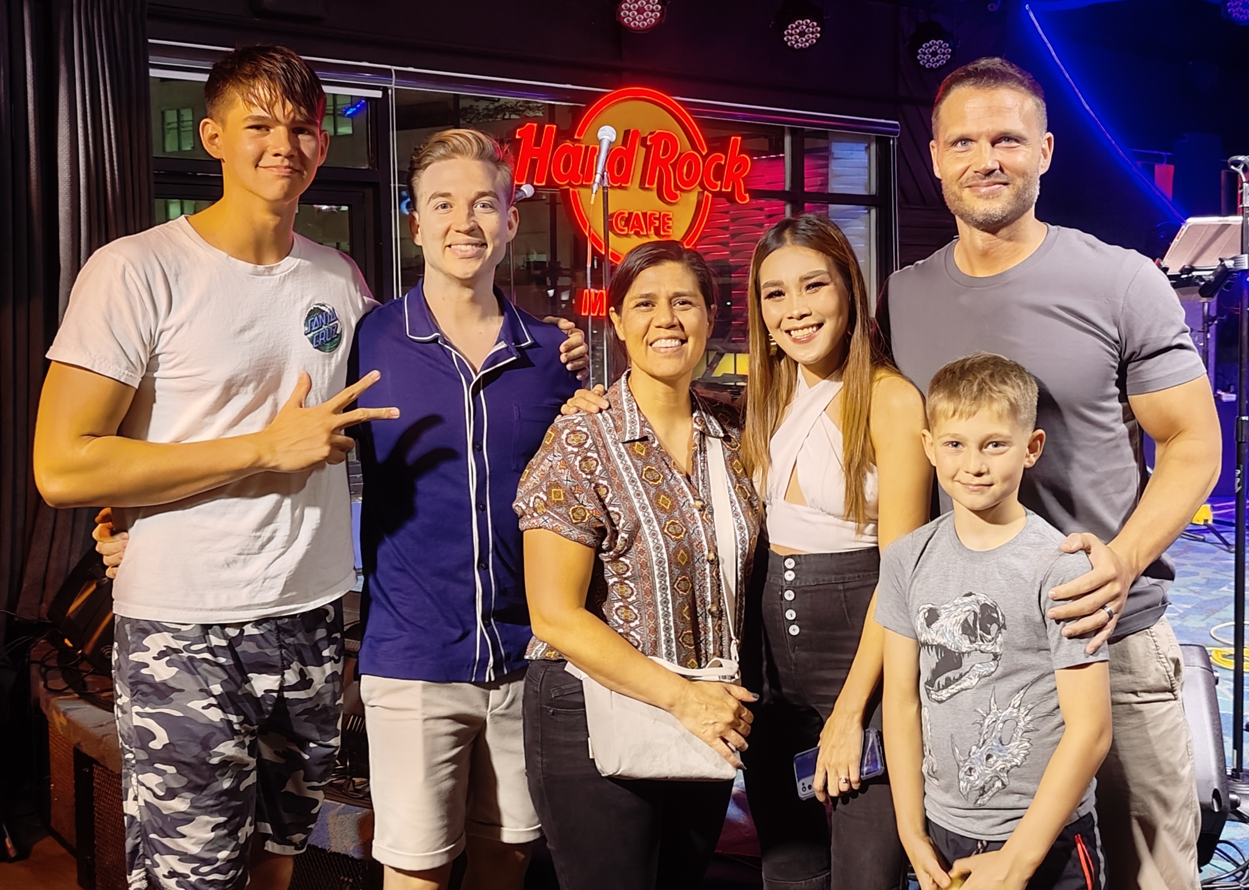 Tia, Mason, Blake, Matt, Drew taking a photo with Chevy from the band Circa who performs at Hard Rock cafe