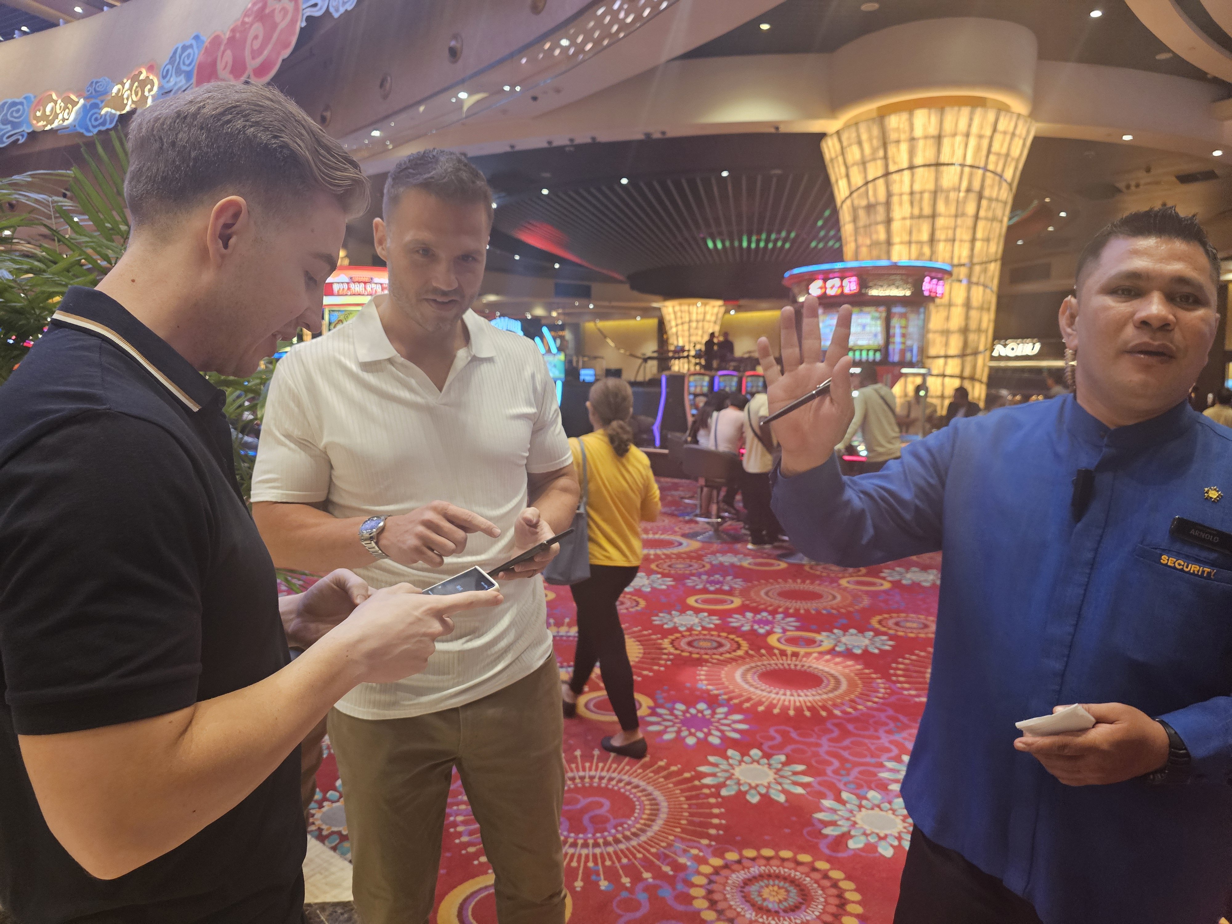 Drew getting asked to show his ID before entering in the Casino area where we will listen to a live band perform