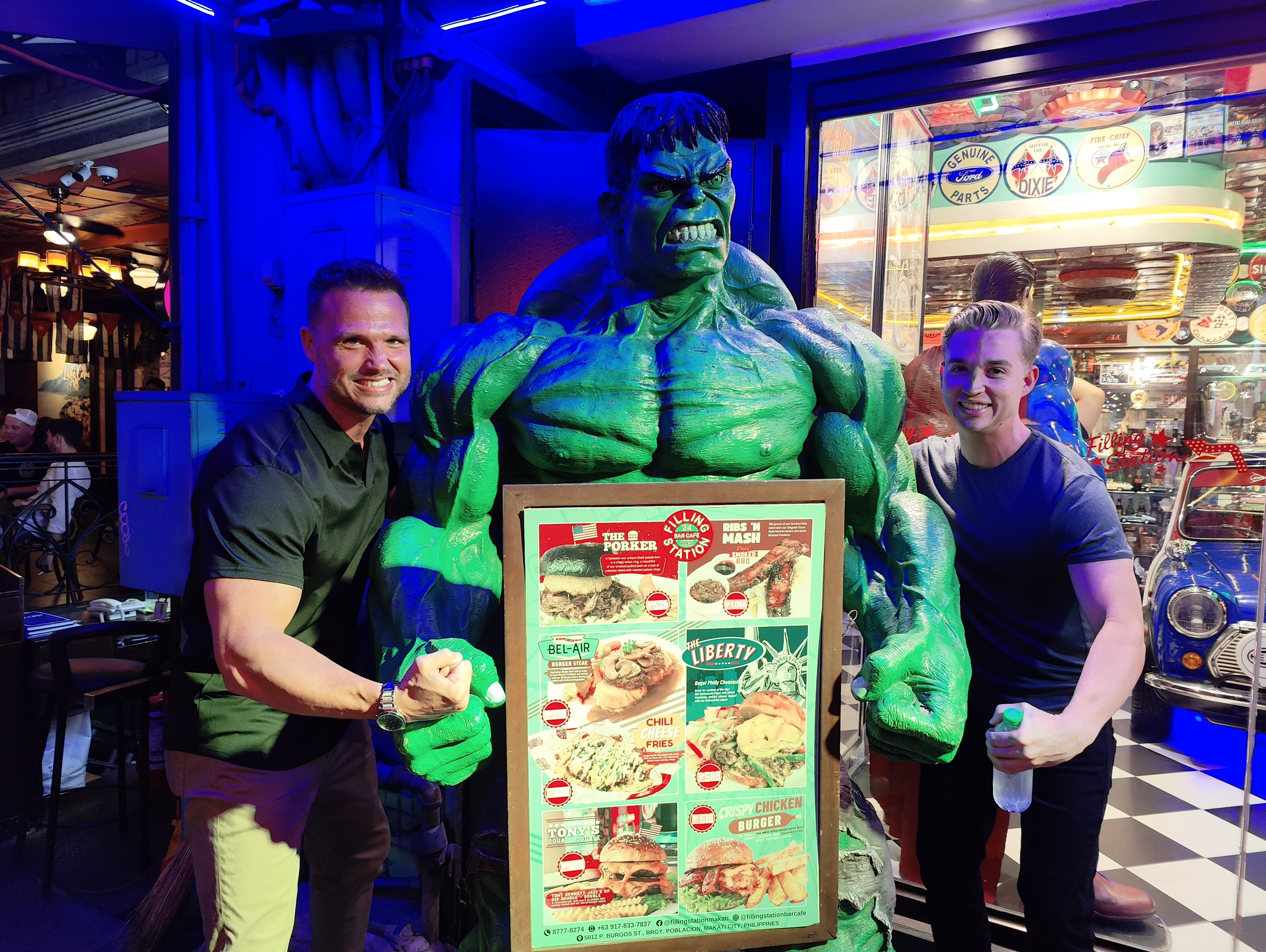Matt and Drew posing with a life-sized Hulk statue at a themed restaurant