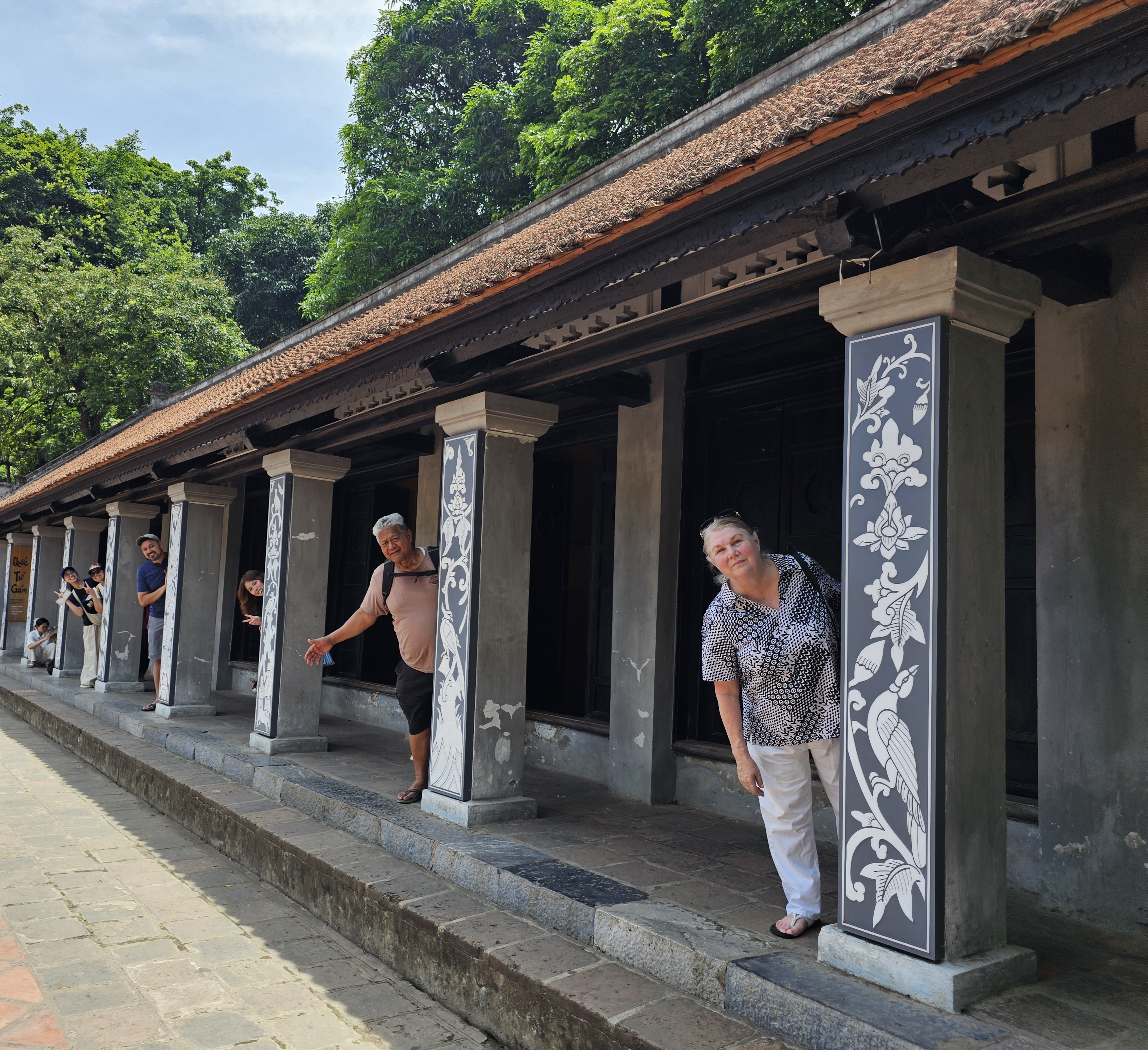 Our family poses playfully behind the columns at the Temple of Literature in Hanoi.