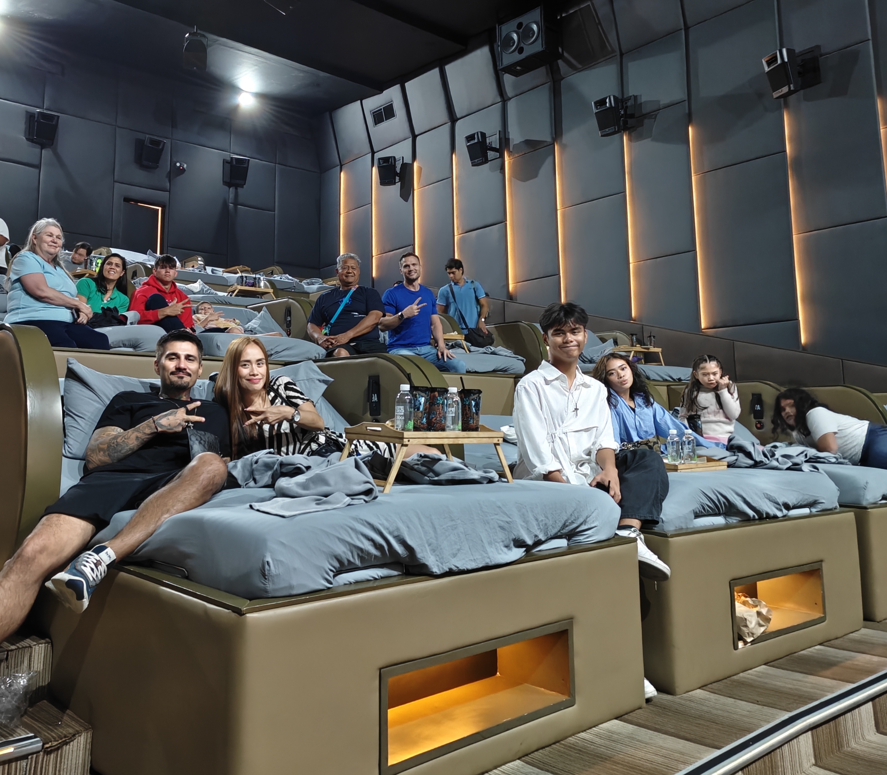 Family and friends enjoy a cozy movie night together at the Tempura cinema with reclining beds.