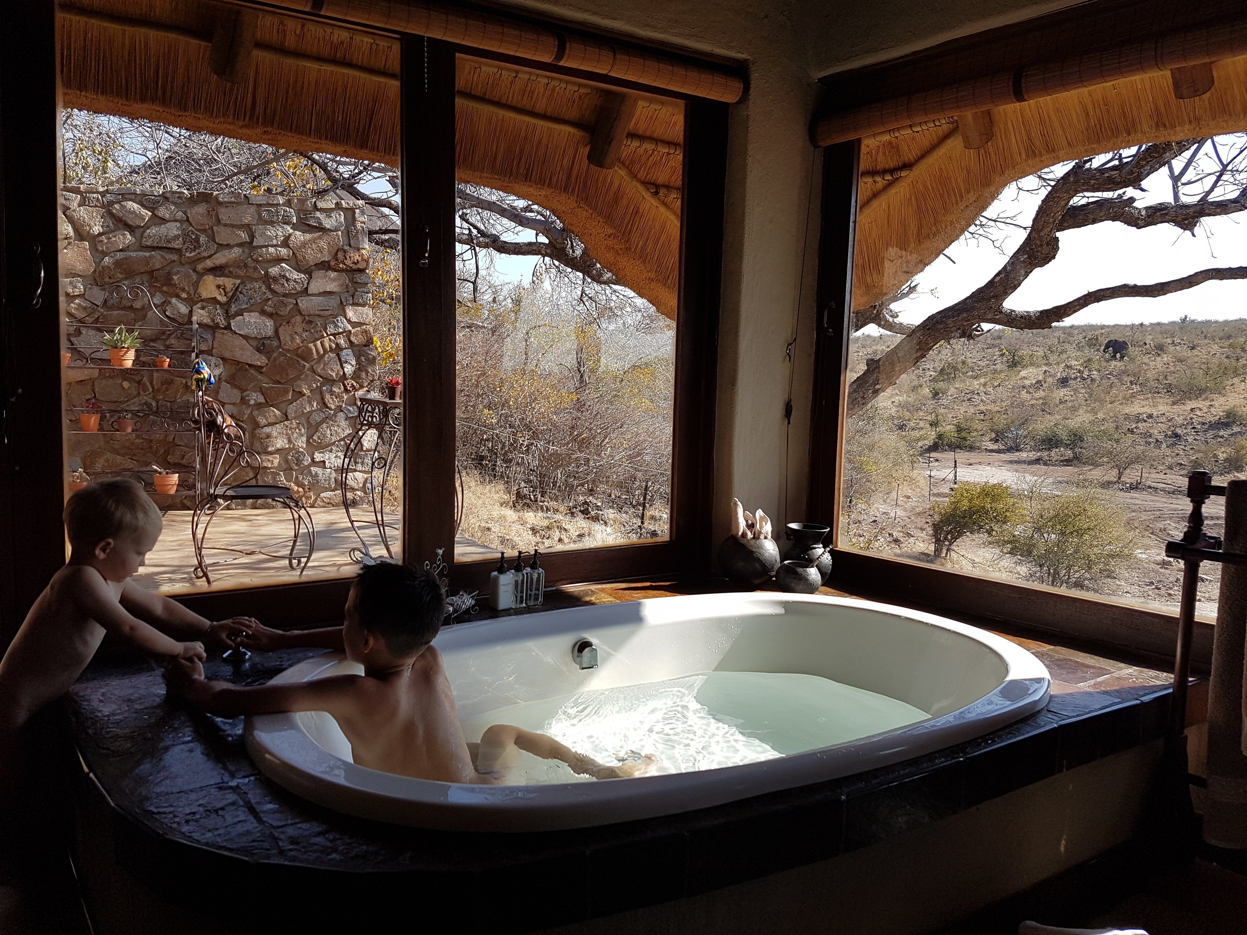 Boys in the bath while watching an elephant in the distance at Tuningi Lodge